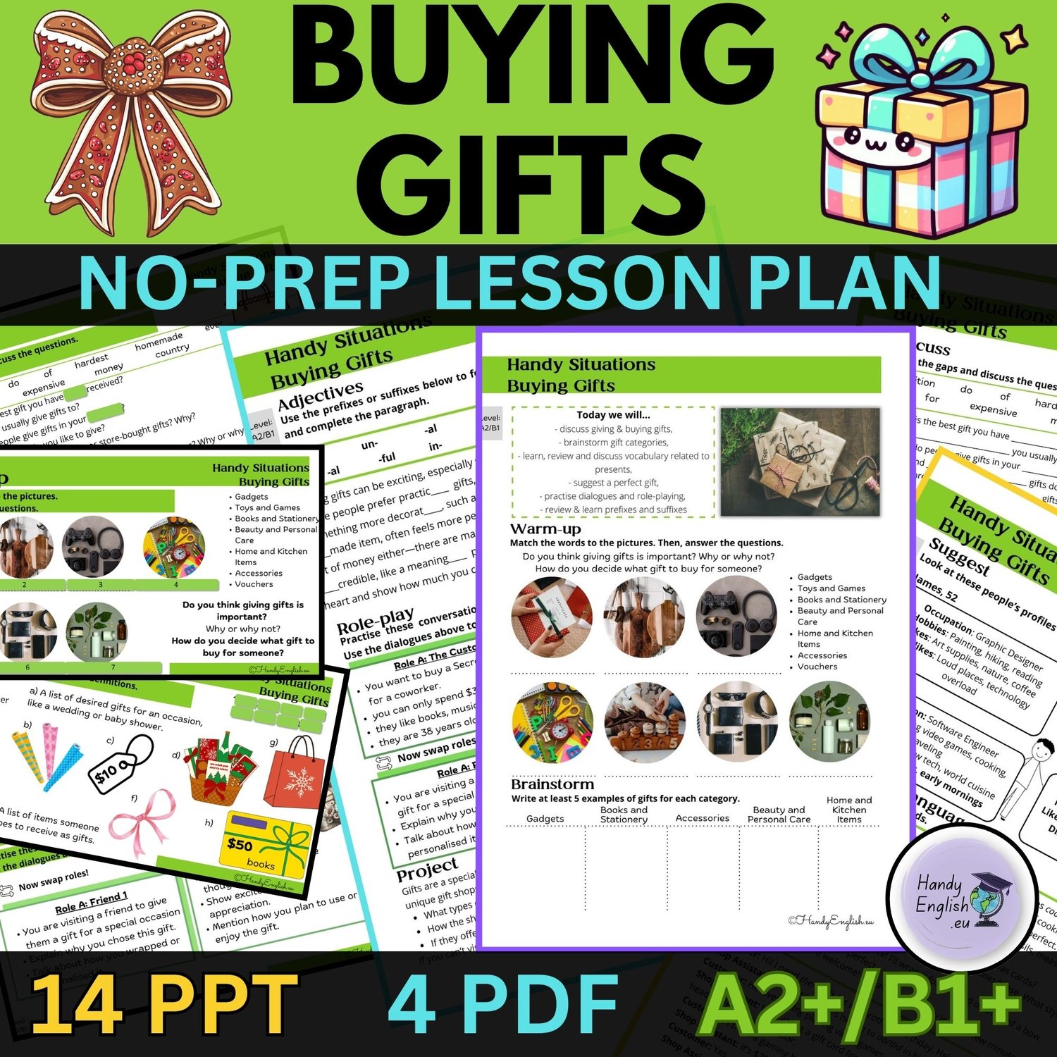 This lesson plan combines English Language Arts, ESL, ELL, buying and giving gifts, Christmas shopping, gift traditions, prefixes, suffixes, survival English, dialogues, Functional Language, Role Plays, speaking, projects, and research in one lesson.