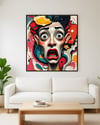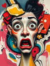 Step into the raw electricity of human emotion with “Overstimulated” – a bold, surreal art piece that captures the chaos, confusion, and inner frenzy of the modern mind. This striking expressionist portrait explodes with color, character, and energy, drawing the viewer into a world where thought spirals and emotional overload are visualized in vivid detail.