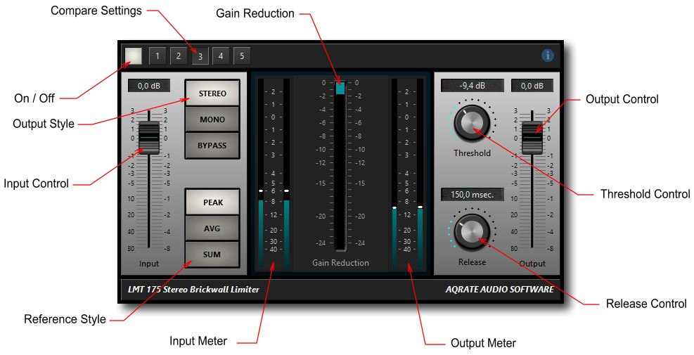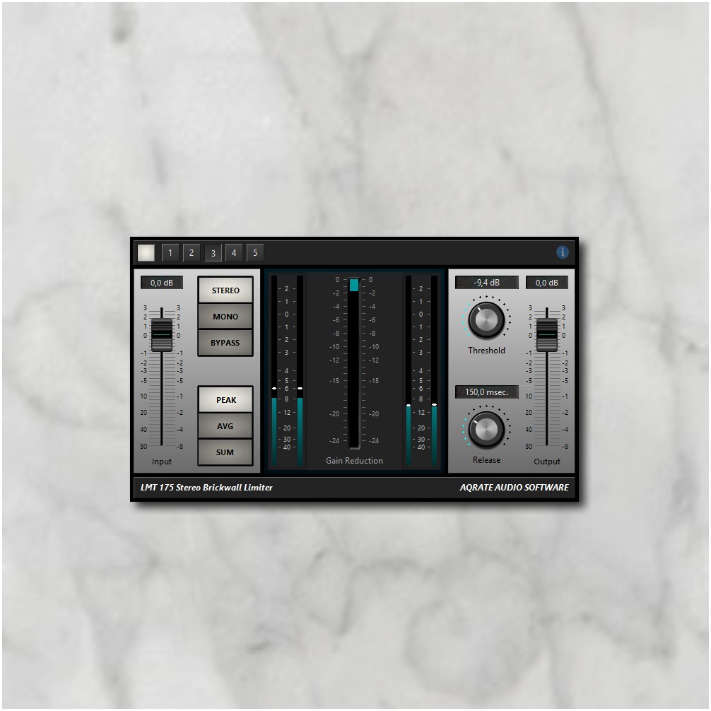 The Brickwall Limiter LMT-175 Plugin prevents overdrive above the set threshold with an adjustable release time. During a session, 5 different settings can be saved and compared. Three different algorithms for reference signal calculating.