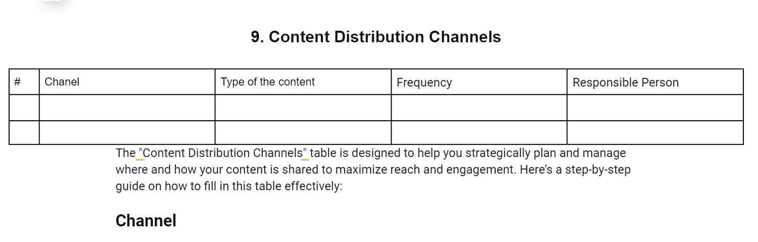 - In-depth Structure: Going beyond basic outlines, our in-depth template of the content strategy dives deep into strategic planning. It covers audience analysis, content mapping, channel strategy, and performance metrics, ensuring no stone is left unturned.