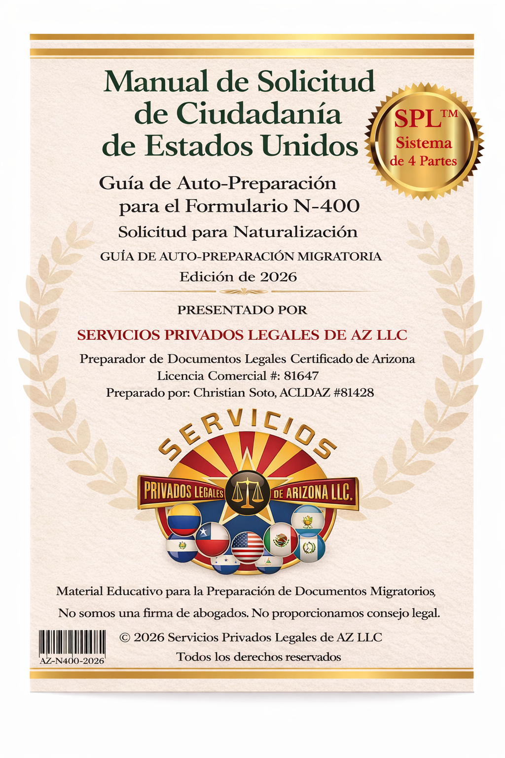 Al adquirir este producto, usted entiende que este kit es una guía educativa de autopreparación diseñada para ayudarle a comprender cómo completar y organizar el Formulario N-400 (Solicitud de Naturalización).
