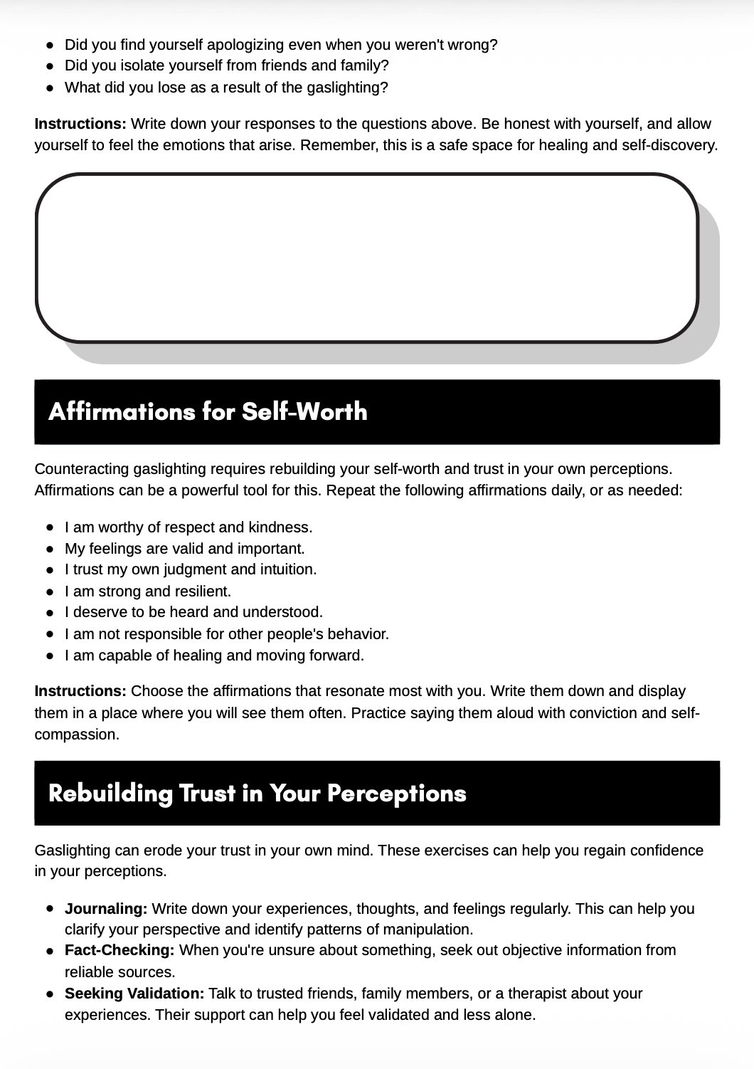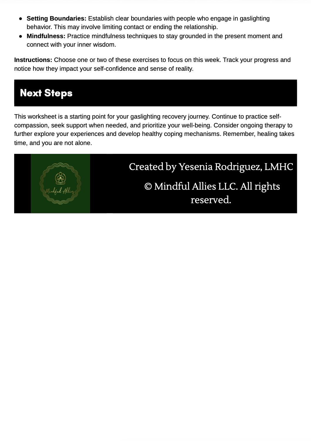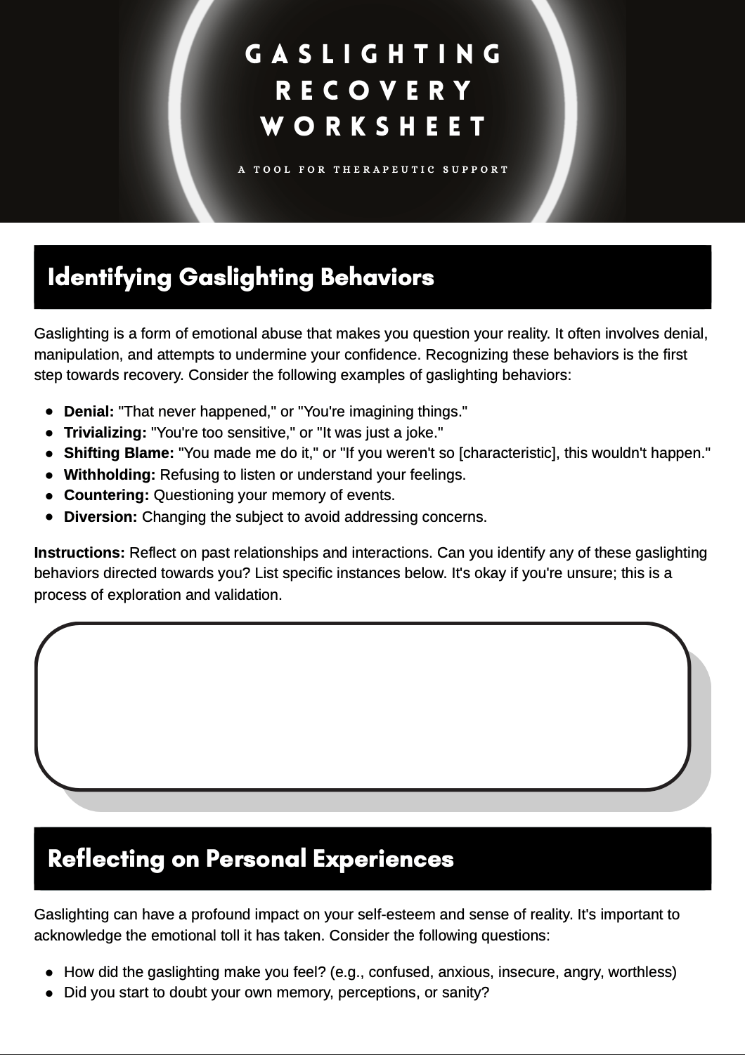 Created by a Licensed Mental Health Counselor (LMHC), the Gaslighting Recovery Worksheet was developed to support individuals navigating the emotional impact of manipulation, chronic invalidation, or relational confusion.