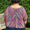The multi-coloured sample is in Size 3 and the blue sample is in Size 4, both shown on someone with a 48"/122cm bust.