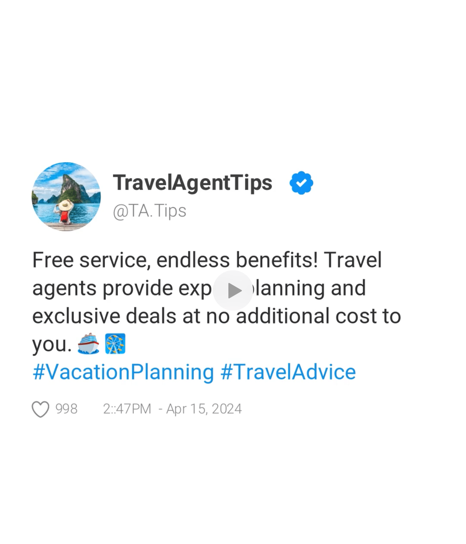 "Enjoy top-notch travel planning without the extra cost. Travel Agents offer free service with endless benefits! 🌴🔑 #FreeTravelAdvice #TravelExpert"
