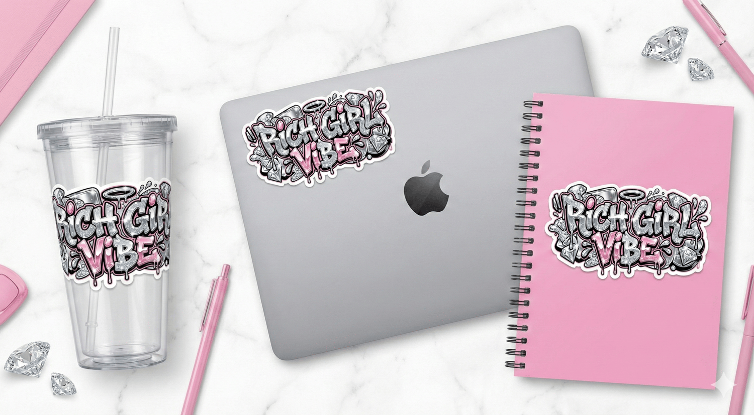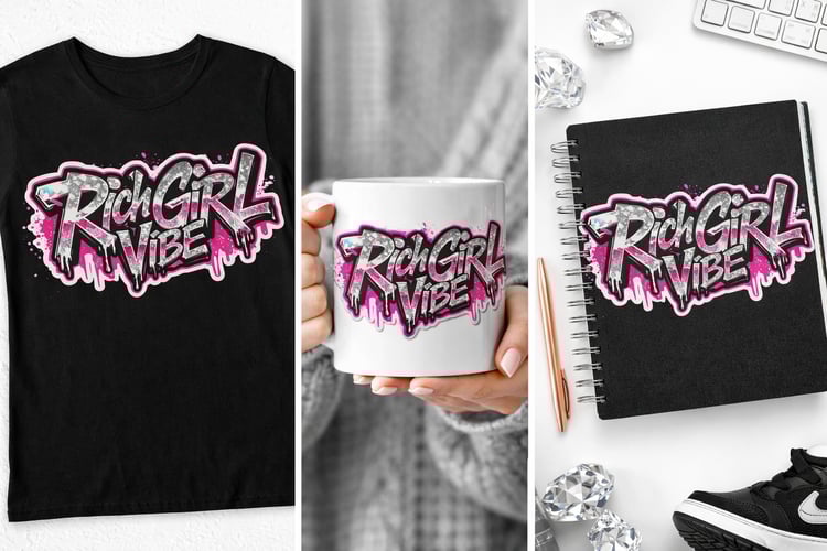 This Rich Girl Vibe PNG design features bold silver chrome typography with sparkling diamond accents and soft pink drip details for a high-end, glam aesthetic. Designed for creators and small businesses who want their products to feel luxe, confident, and unapologetically feminine.