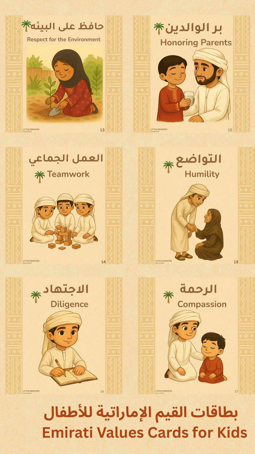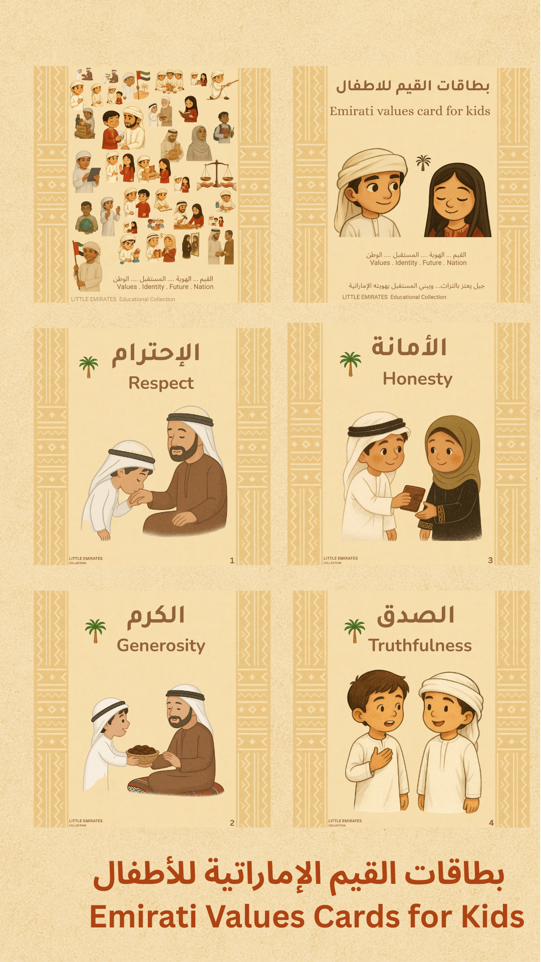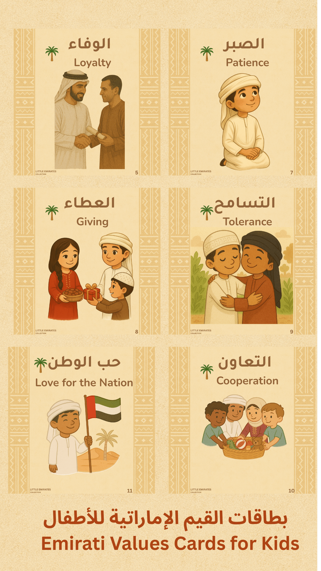 Beautiful educational flashcards that teach kids the positive values and good manners inspired by Emirati culture — such as Respect, Generosity, Cooperation, Tolerance, and Love for the Nation 🇦🇪