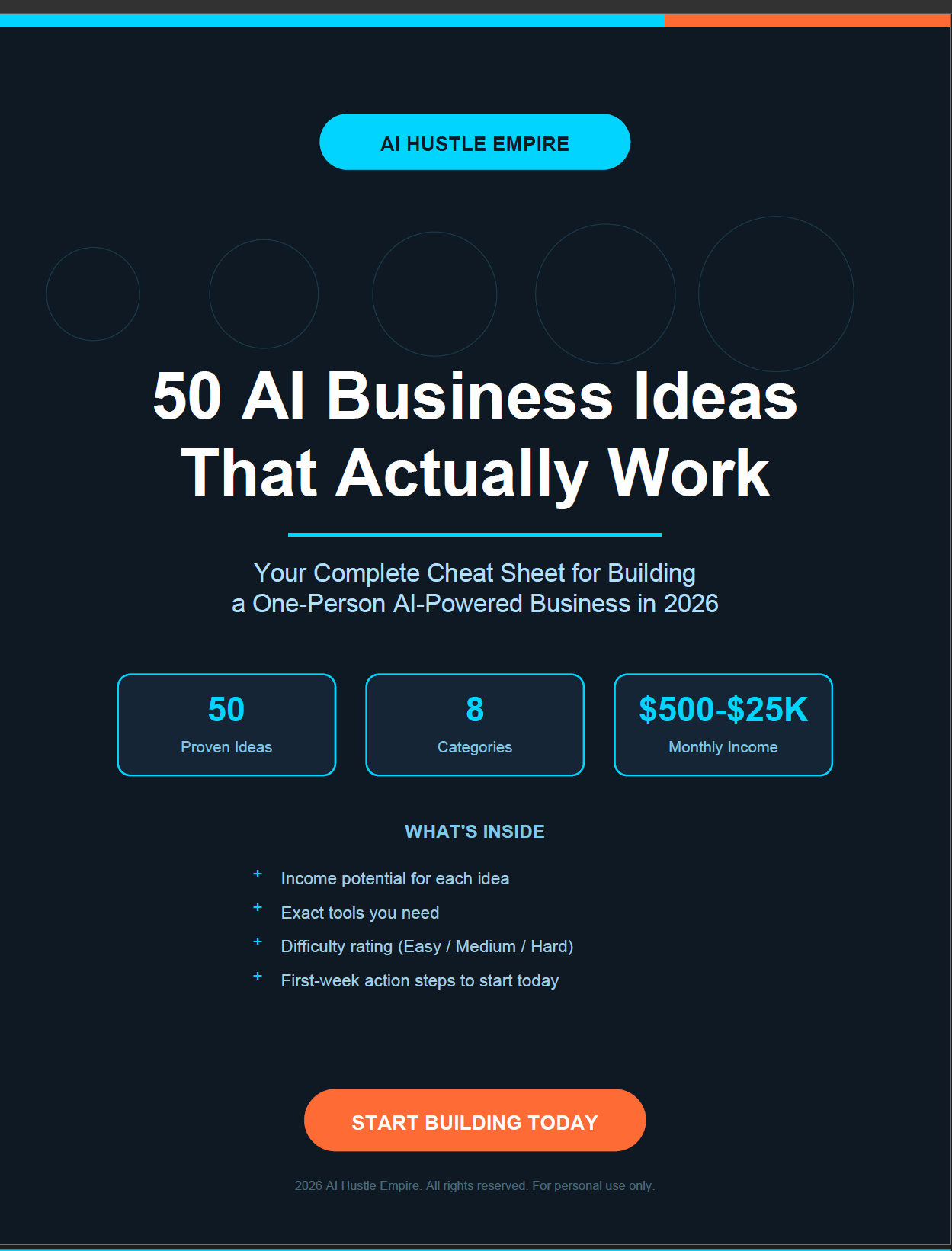 50 proven AI business ideas — each with income potential ($500-$25K/mo), exact tools you need, difficulty rating, and a step-by-step first-week action plan.