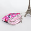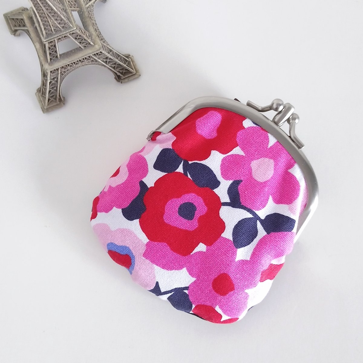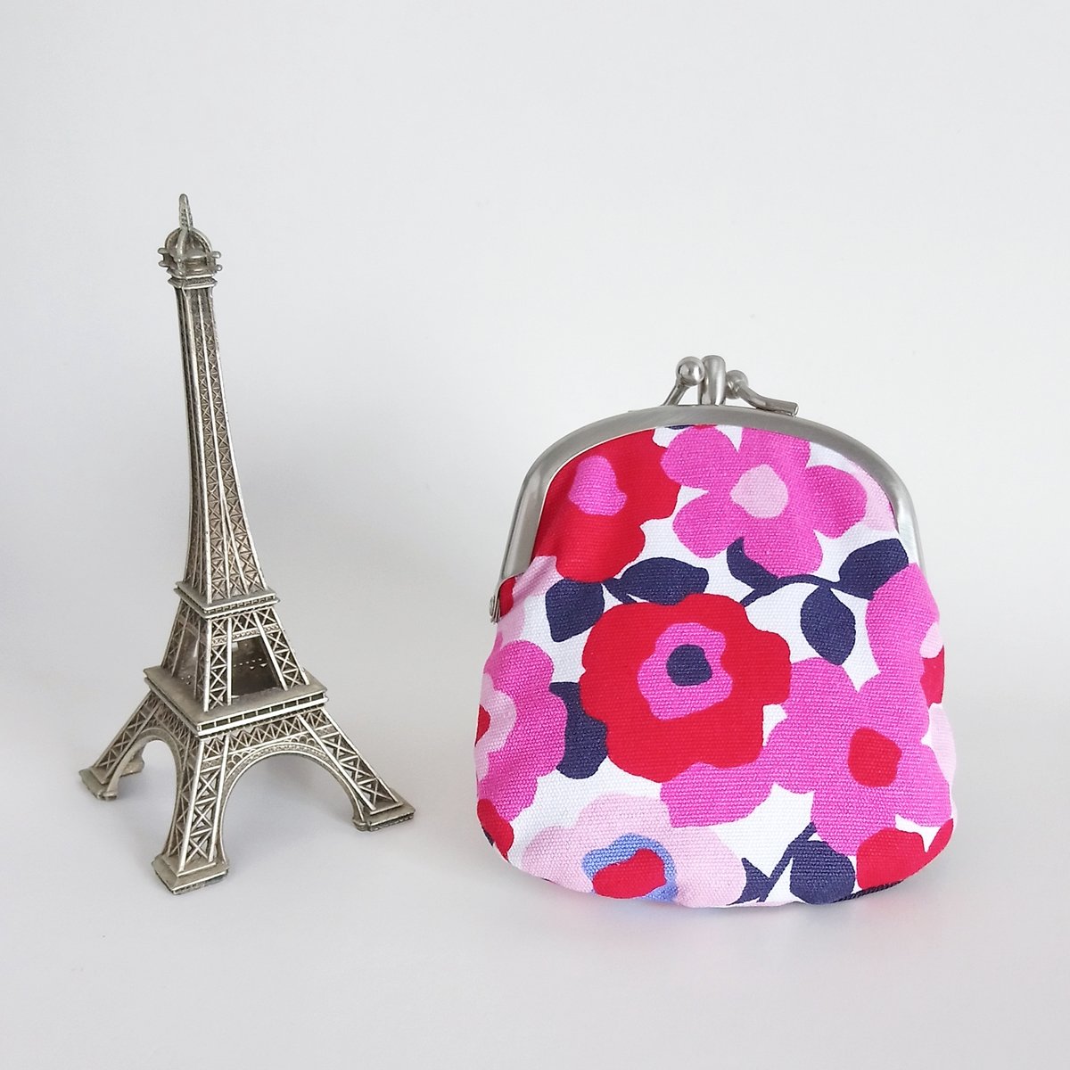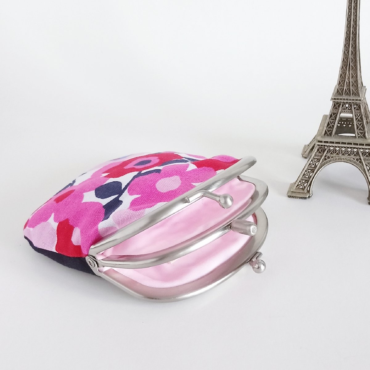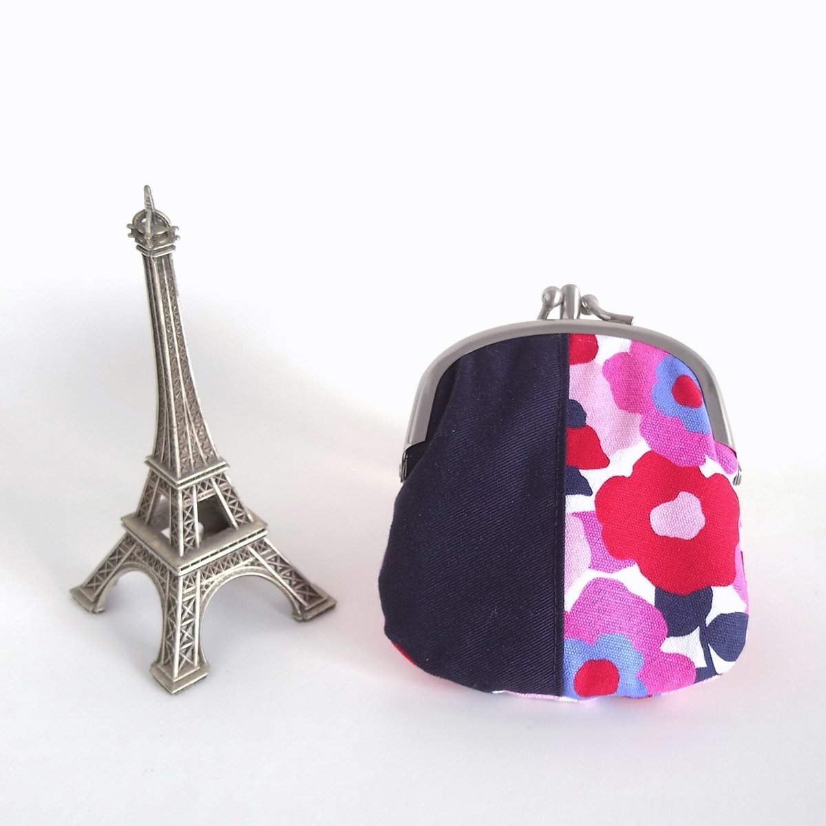 This lined kisslock pouch has different designs on each side and presents two different styles. With two compartments, coins and bills or credit cards can be kept separately.