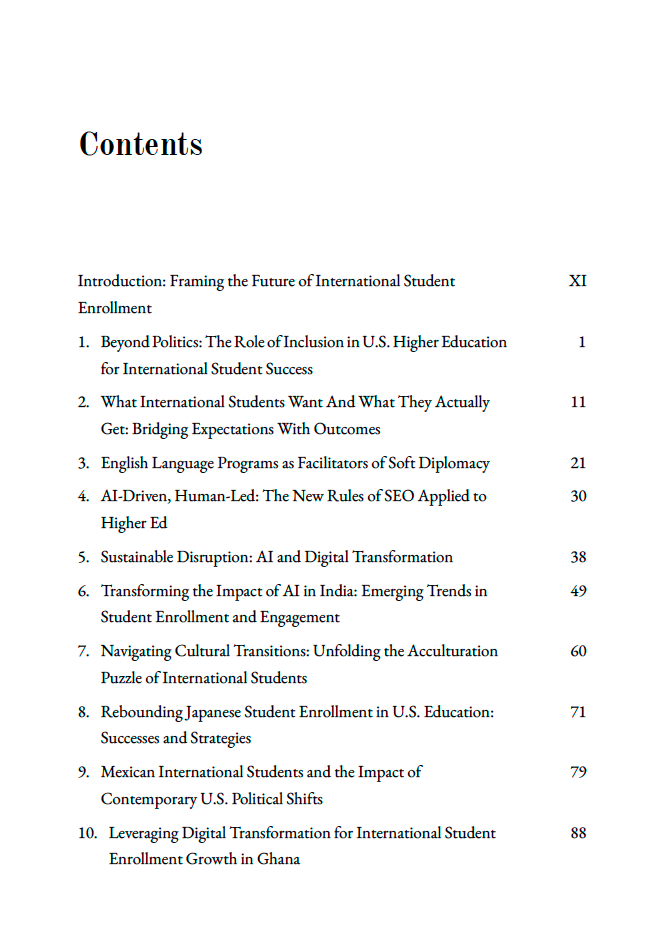 In a rapidly changing world, Navigating the Future of International Enrollment offers both clarity and vision for building more inclusive, resilient, and globally engaged campuses. Drawing on diverse voices and practical experience, it inspires educators and policymakers to reimagine internationalization for the future. Thatcher A. Spero, PhD Professor of Education, Musashino University, Japan
