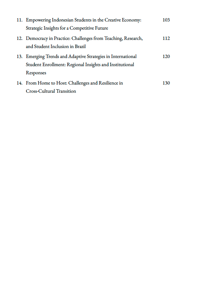 Readers will find discussions that range from the role of English language programs in soft diplomacy to the impact of creative economies in Indonesia, from Japanese enrollment rebounds to the challenges faced by Mexican and Brazilian students, and from the promises of AI in higher education to the dilemmas of fostering democracy and inclusion in classrooms and research. Together, these contributions illustrate the complex realities of international student enrollment today and provide actionable insights for educators, policymakers, and institutional leaders seeking to build inclusive, resilient, and globally connected campuses.