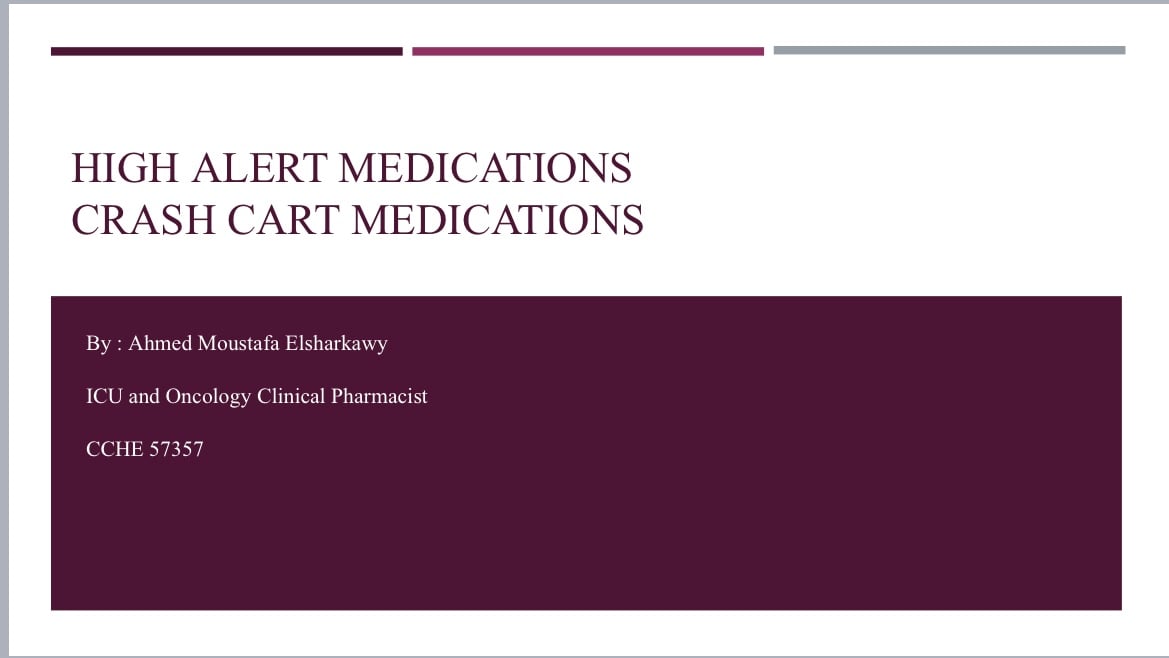 This is a last updated and professional presentation about high alert medications, how to avoid errors with high alert medications in addition to crash cart medications ( indications - doses - compatibility- side effects ). It is very important to know if you are a healthcare professional.