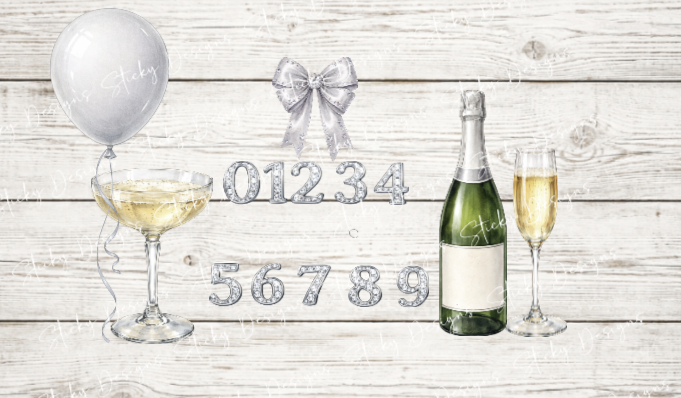 Denim jacket with flowers and without flowers, diamond, champagne flute and saucer, champagne bottle, bow and 0-9 diamanté numbers, lot's of uses with these designs
