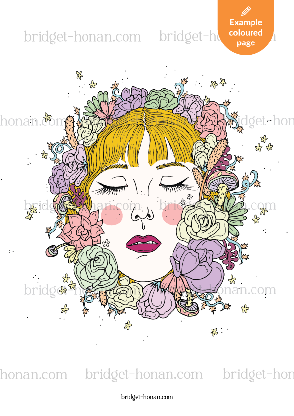 Unleash your creativity with this beautiful digital colouring page featuring a woman’s face surrounded by flowers, mushrooms, vines and other flora and fauna.