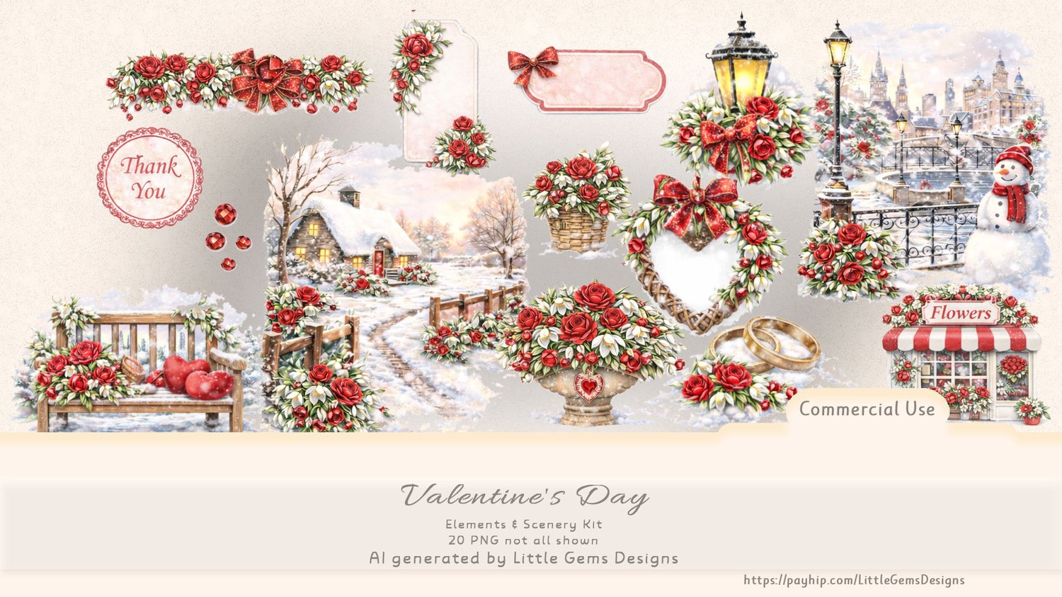 This digital kit contains a collection of romantic winter-inspired Valentine elements and cozy scenery illustrations. Perfect for junk journals, scrapbooking, planners, cards, printable designs, and creative commercial projects.