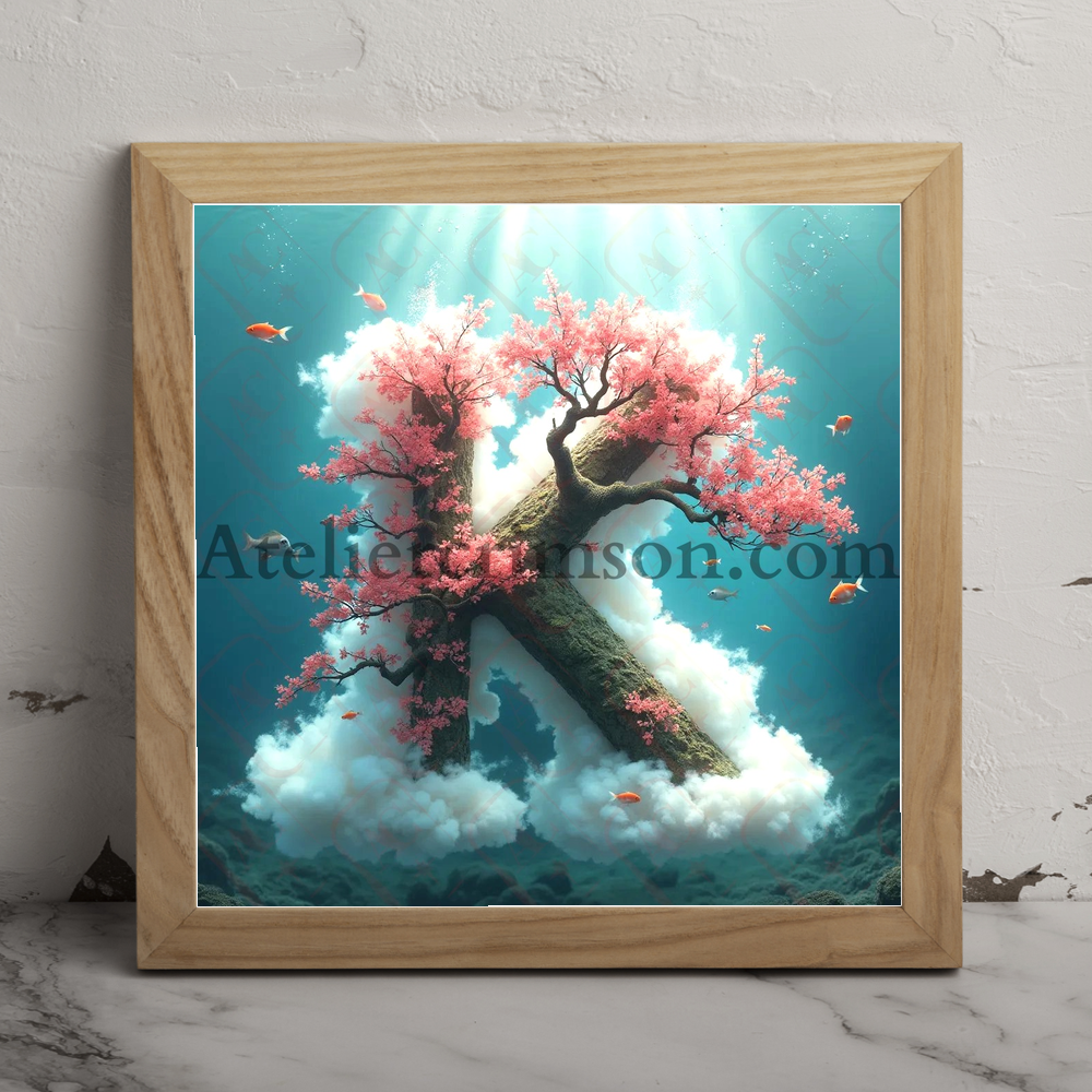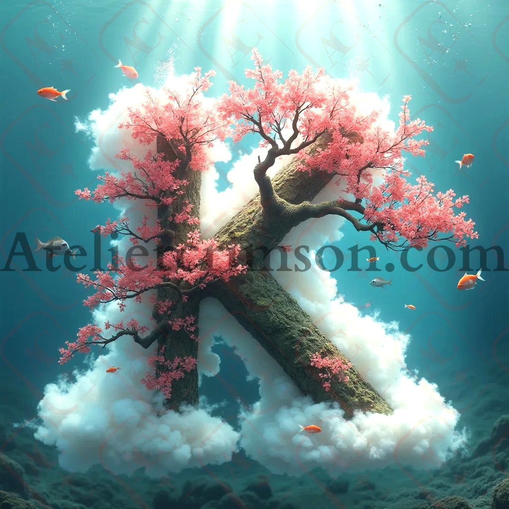 The letter K bonzai aquamarin cloud a captivating digital painting with a serene underwater bonsai. Download Now this high quality AI-generated image, perfect for adding a touch of tranquility and creativity to any space.