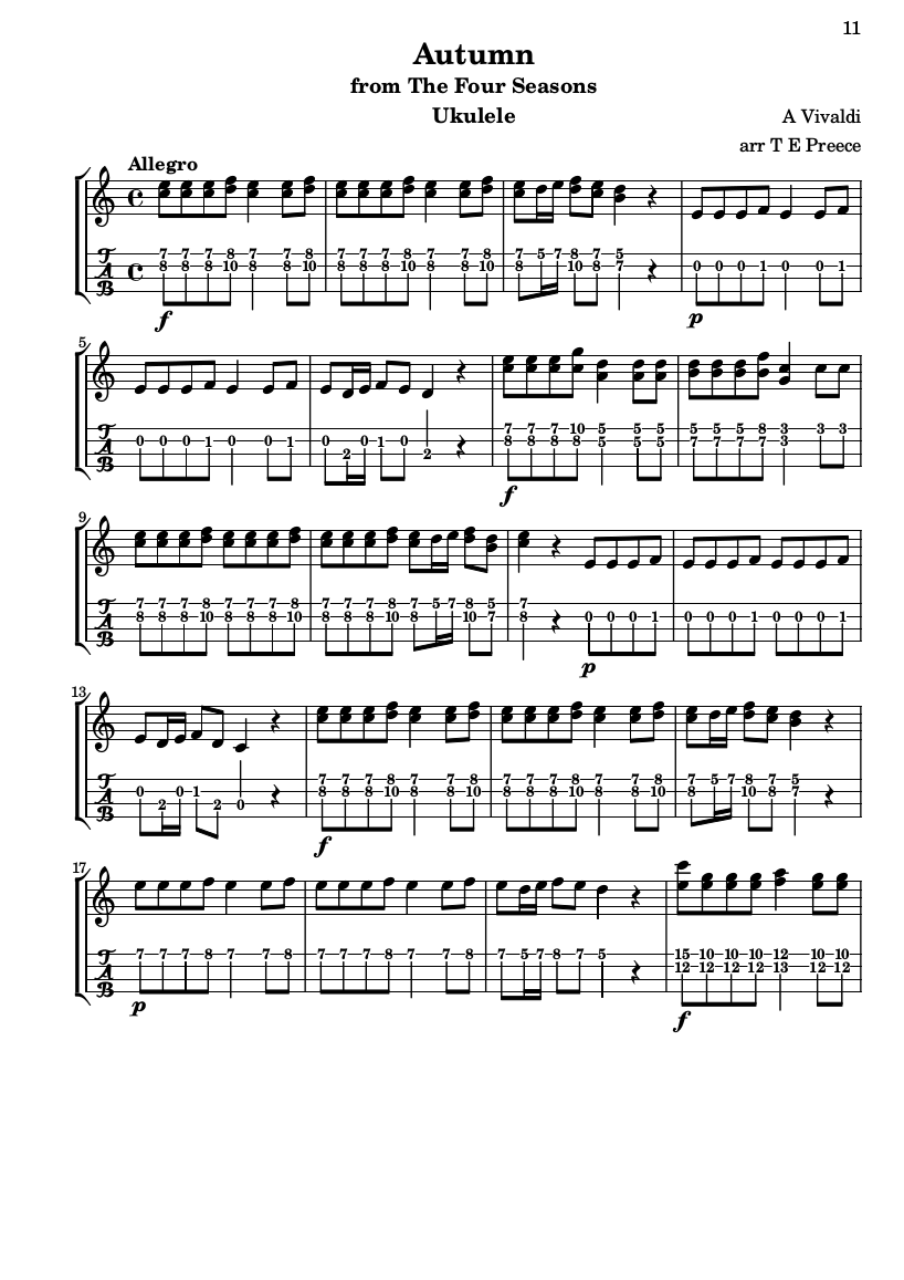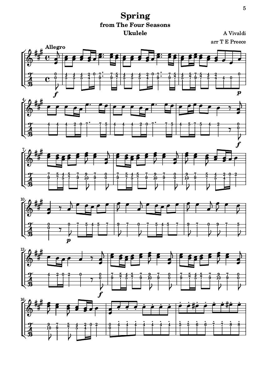 This arrangement presents the most famous theme from each of the concertos as a duet for ukulele and baritone ukulele. The music is intended to be accessible to beginners, yet interesting enough for more advanced players, and would make an ideal performance piece. Each movement is presented over one or more double pages, with the ukulele part on the right and the baritone ukulele part on the left – thus allowing the musicians to play from the same music stand, and for the student to easily cross-reference the two parts.