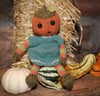 This is a pattern for a little pumpkin head person. It is worked in the round as much as possible. The pieces are worked separately and then joined. The sample shows domed buttons for eyes and an embroidered nose.