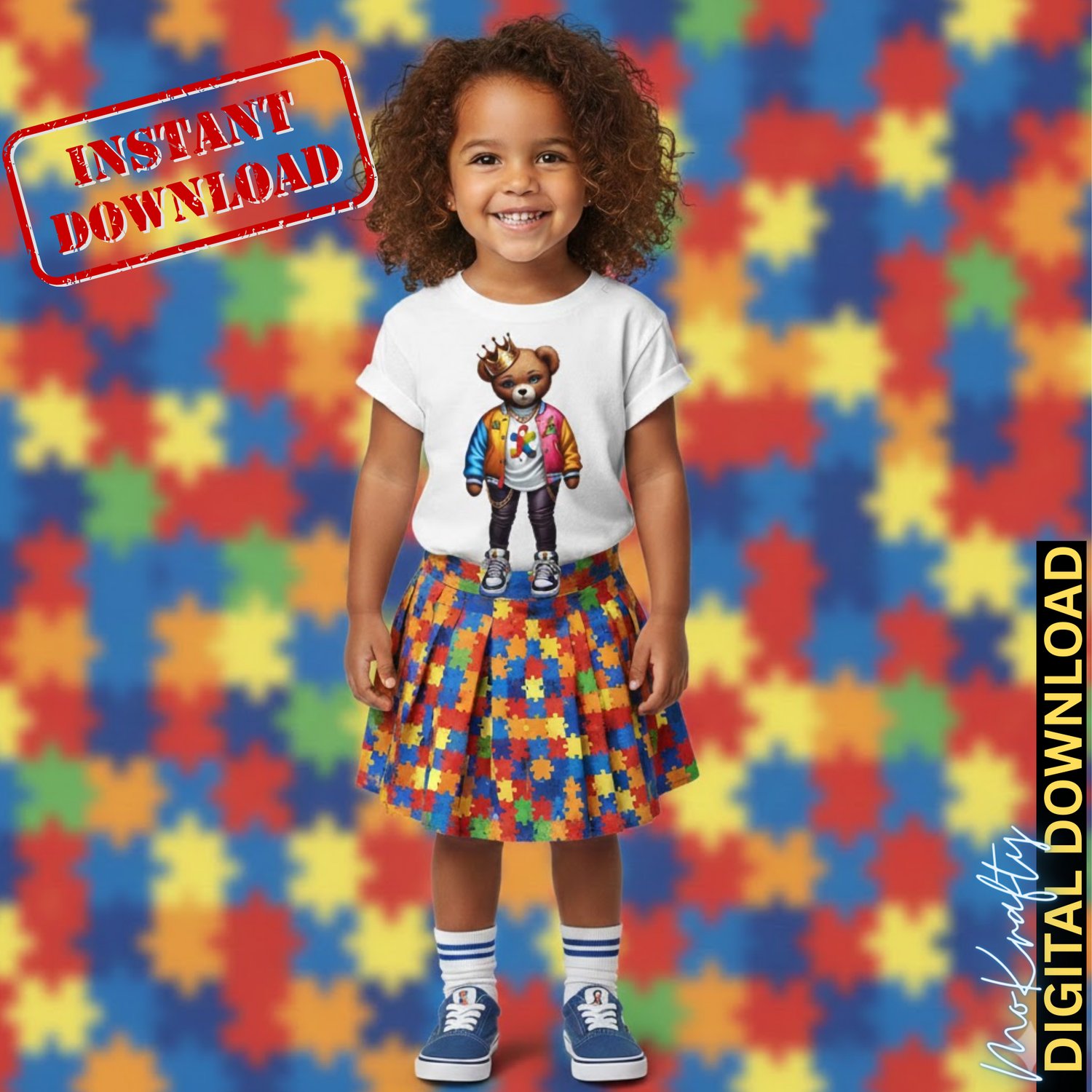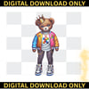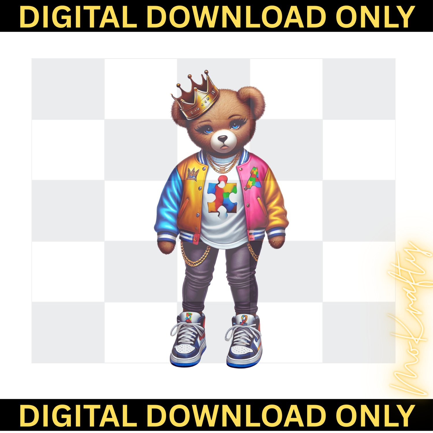 This high-quality "Autism Awareness Girl Bear" digital design features a fashion-forward teddy bear rocking a crown, a colorful varsity jacket, and the iconic puzzle piece symbol. It is the perfect graphic for those who want to support autism awareness while staying on-trend with a bold, urban aesthetic.