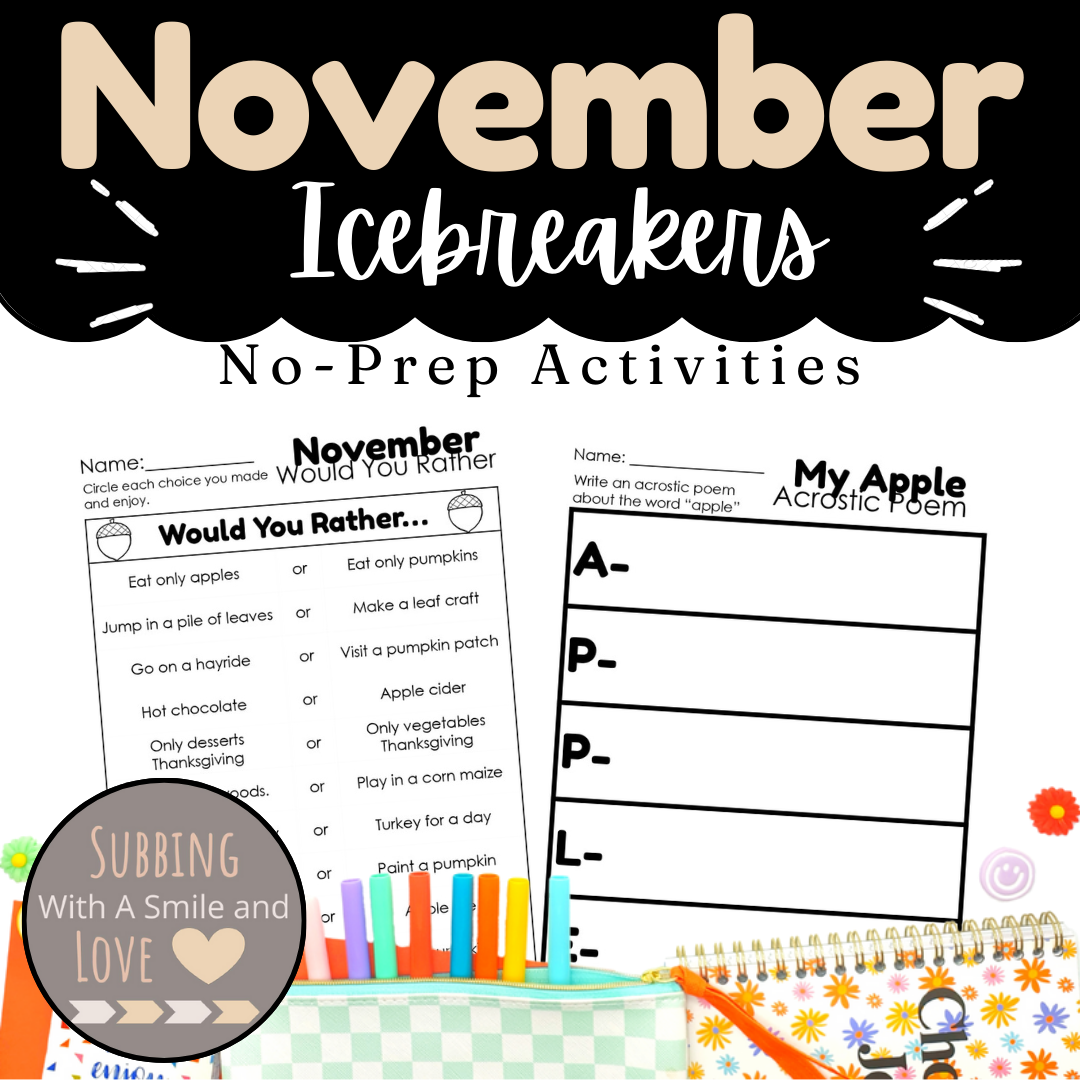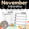 November Icebreakers No-Prep Activities for Kindergarten through 2nd Grade