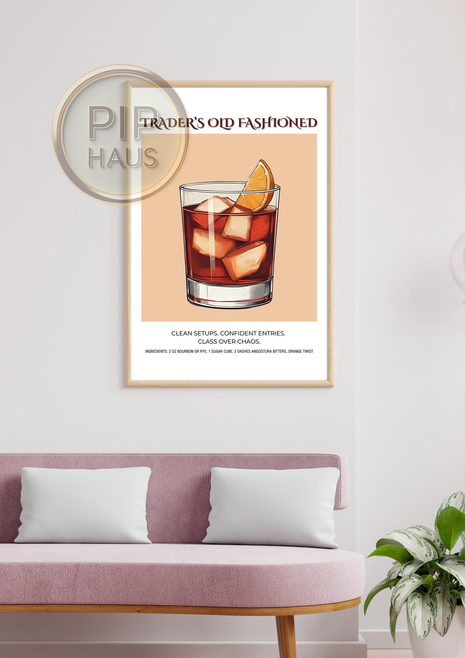 Each print pairs a classic cocktail with a trading-inspired tagline to motivate you through the wins, the losses, and the late-night chart sessions.