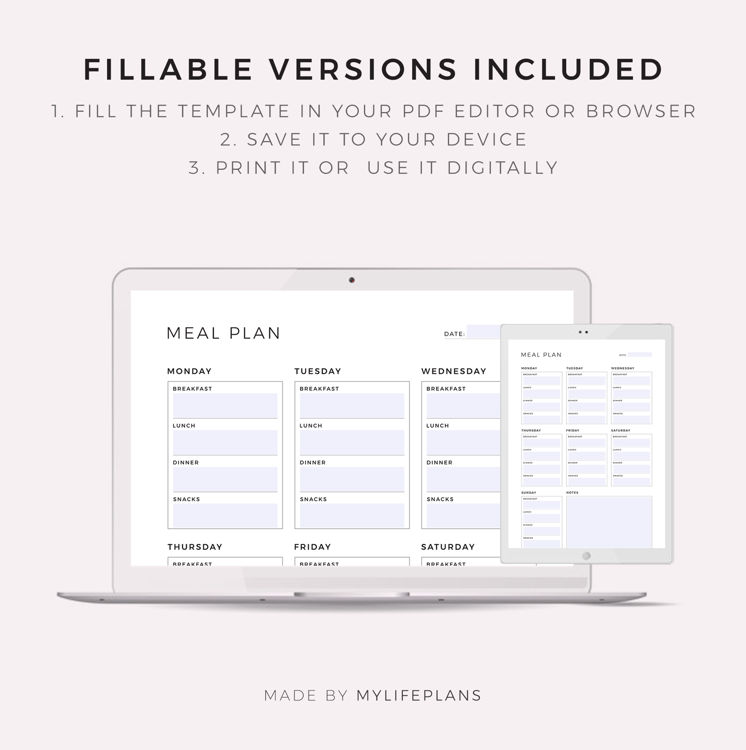 Weekly Meal Planner, Printable & Fillable PDF, A4/Letter Size, Instant Download