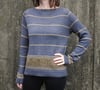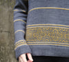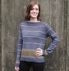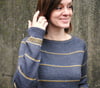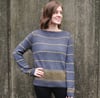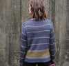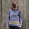 This garment is worked top-down, in the round, with a modified raglan construction. Short row shaping is incorporated immediately after the neckband to lift the back of the neck and optimise the fit. A regular pattern of increases is worked to shape the raglan yoke and, at the same time, coloured stripes are worked at regular intervals. Once the yoke is completed, the stitches are separated into body and sleeves. Both the body and sleeves are worked in the round, continuing the regular pattern of coloured stripes before a section of stranded colourwork is worked above the waistband and cuffs.