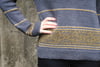 The wearer is 5’10” / 178 cm with a 37” / 92.5 cm chest circumference. The sample has been worked in size L, giving the wearer 7” / 17.5 cm of positive ease at the chest. To accommodate the wearer’s height, 25 rounds of main colour have been worked between each pair of stripes (instead of 20) and an extra 1” / 2.5cm of yoke depth has been worked before separating for body and sleeves.