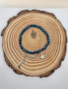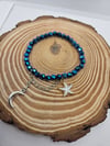The stunning bracelet features deep blue, faceted beads that capture the essence of the night sky, paired with delicate silver charms. A crescent moon and a golden starfish dangle elegantly from the bracelet, creating a perfect balance of celestial and oceanic themes. The silver chain adds a touch of sophistication, making this piece an ideal accessory for those who love a blend of the mystical and the sea. Whether worn casually or to complement an evening look, the ''Ocean Moon Charm'' bracelet is sure to make a statement.