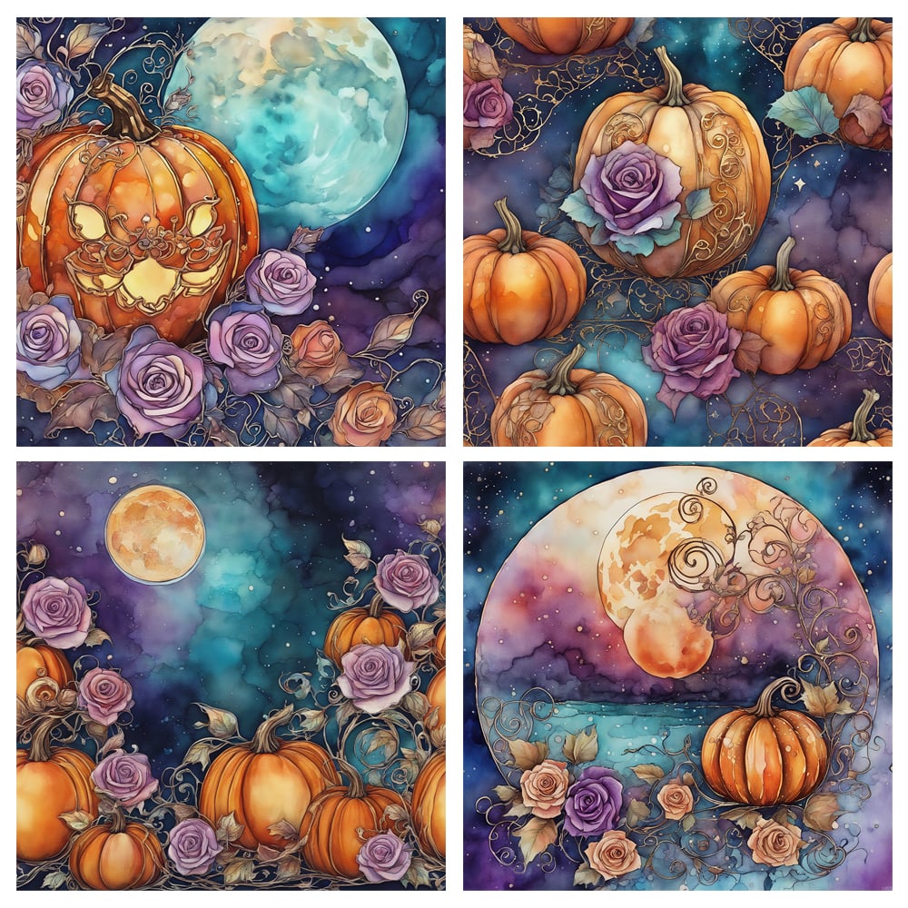 12 illustrations of Whimsical magical Pumpkins. This backgrounds are perfect for Graphic design projects, sublimation designs, scrapbooking, cards, journals, invitations, book designs, digital media, social media banners, posters, wallpapers, and more.