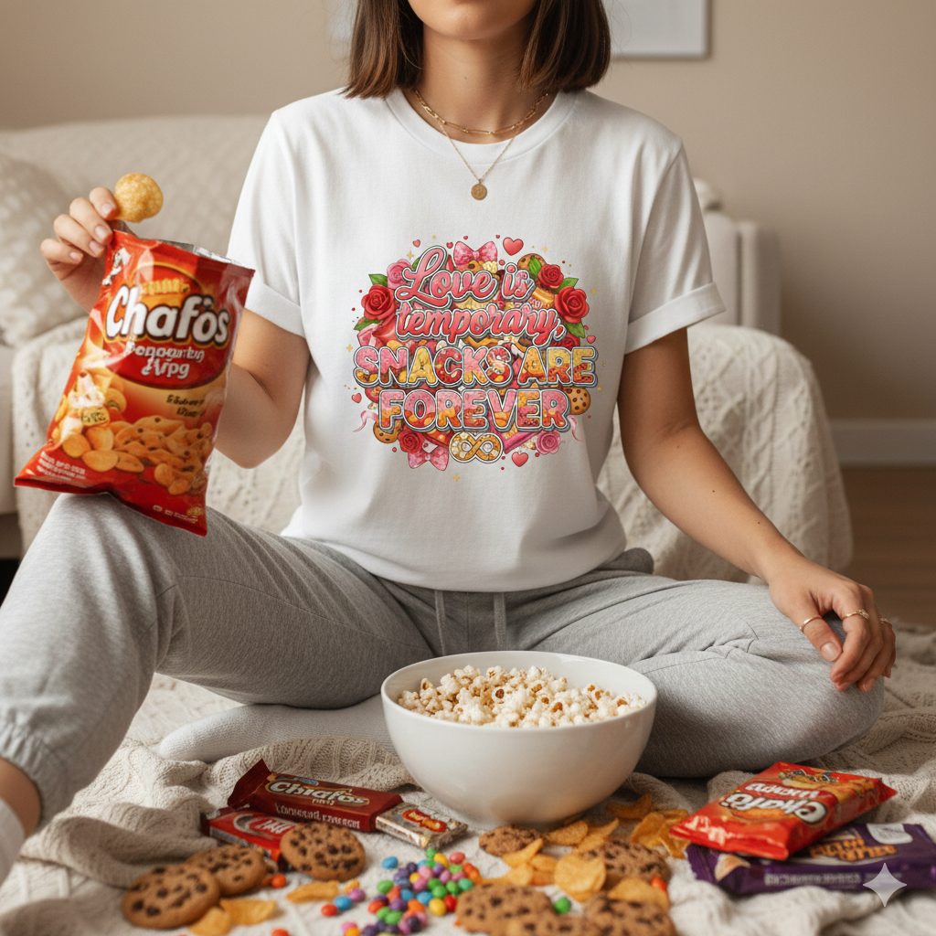 "Love is temporary, snacks are forever" - Relatable snack enthusiast design