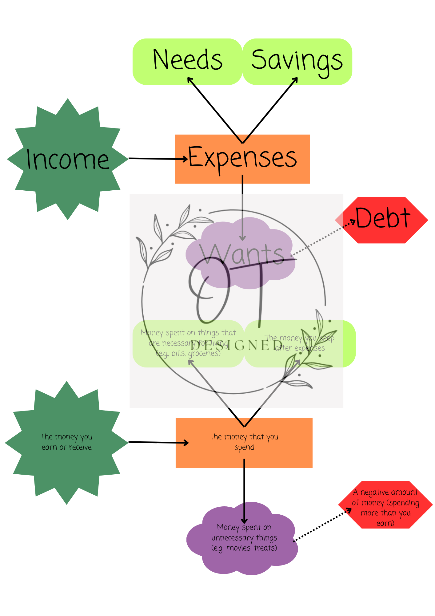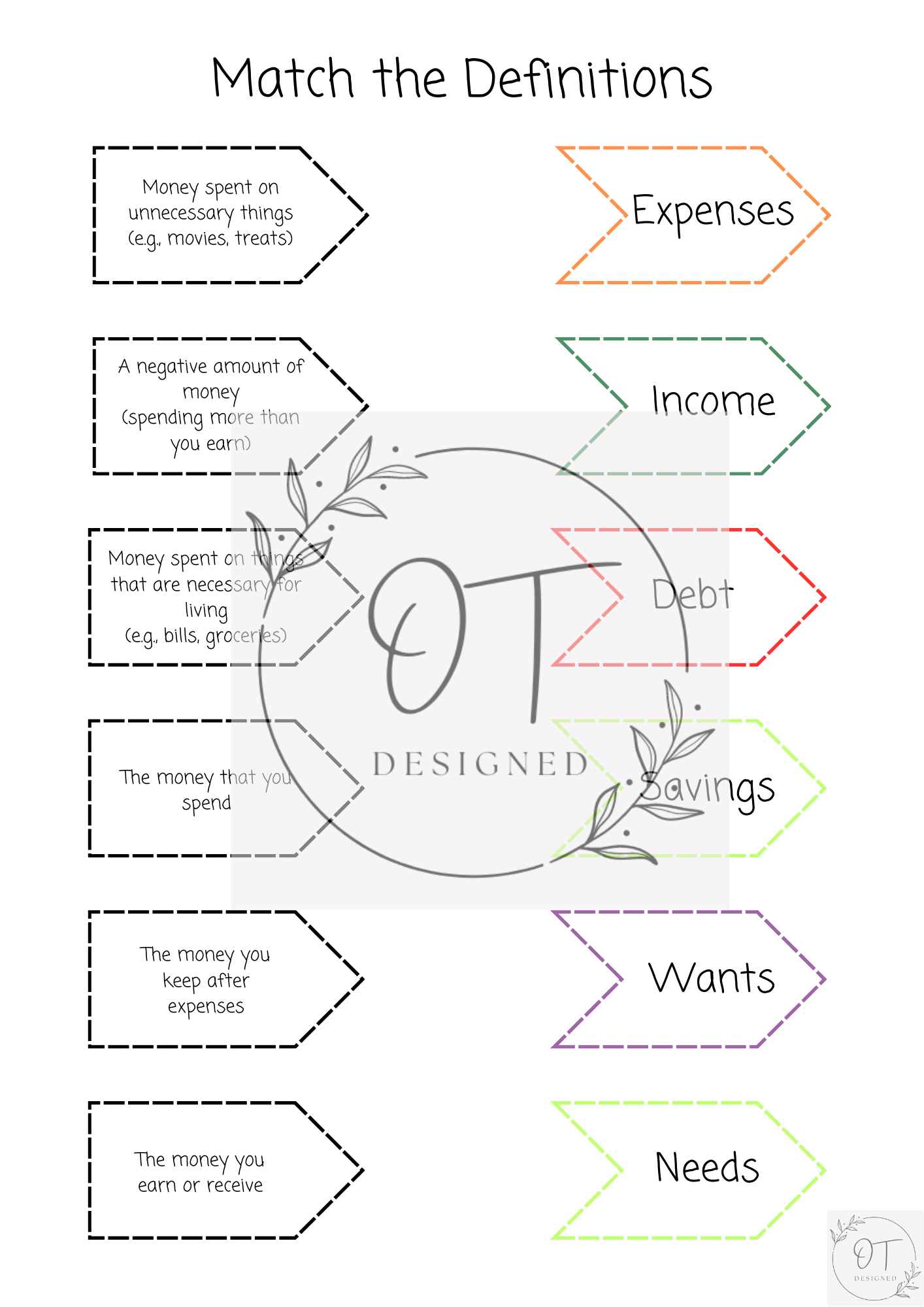 The language used in the financial world can be really confusing! This flowchart and matching game help teach terms that are regularly used when learning budgeting skills. It's also a good place to start when you're unsure of the client's knowledge or understanding of budgeting.