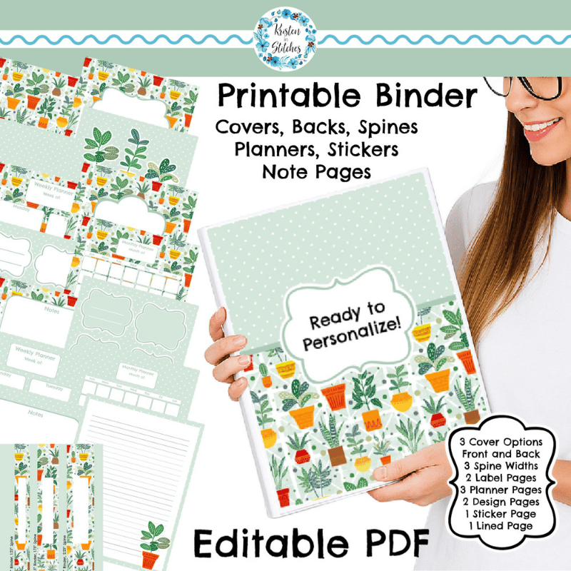 This editable 16 page PDF set includes everything you need to personalize and organize your binders in a fun and colorful way. Featuring a pretty plant pot theme.