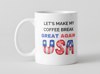 Need a little patriotism with your caffeine fix? This "Let's Make My Coffee Break Great Again" mug design is the perfect way to add some USA pride to your daily brew. Whether it's for work breaks, morning rituals, or a cheeky gift, this design will energize your coffee moments with a touch of humor and American flair.