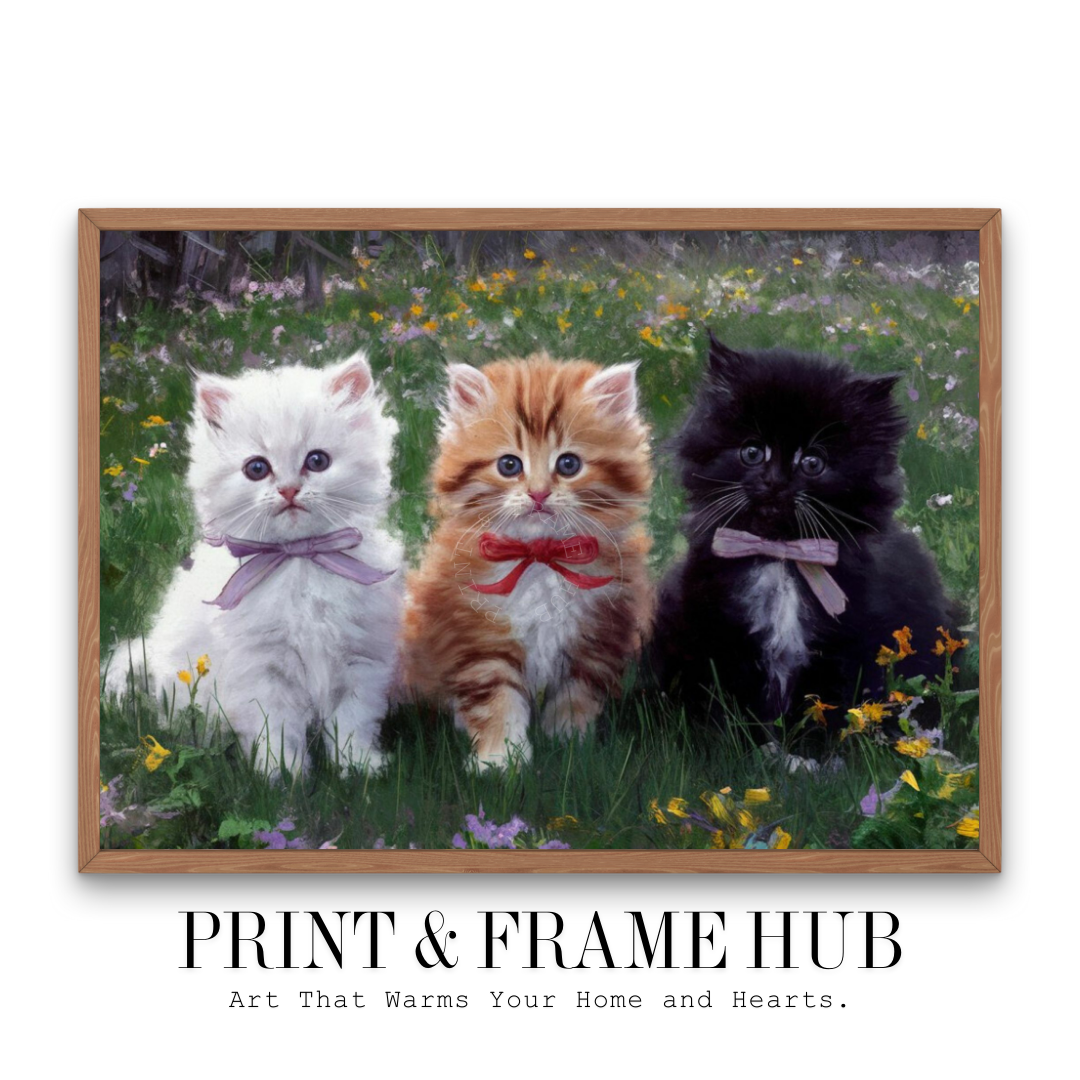 A vibrant painting featuring three kittens in a colorful meadow. The lively composition and charming subjects make this artwork an eye-catching addition, perfect for adding a cheerful touch to your home.