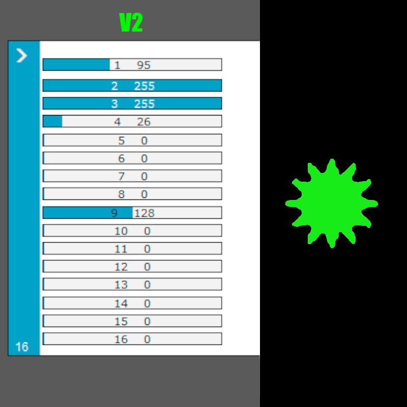 * Verifique que coincidan estos canales: 3 Dimmer, 2 Strobo / Shutter, 1 en el valor 88 (V1) / 95 (V2) = Color Verde, 4 en el valor 50 (V1) / 26 (V2) = Gobo de Sol, 9 foco (ver fotos 4 y 5).