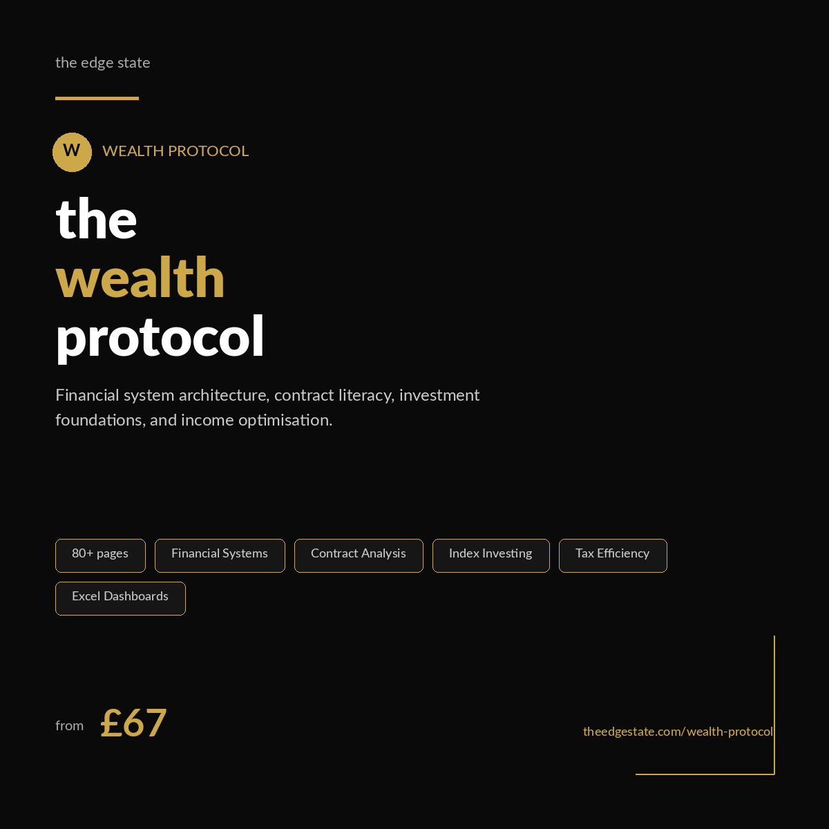 The Master Protocol (80 pages) — Behavioural architecture — the behaviour gap, why your brain sabotages wealth, automation frameworks, rule-based decisions, weekly review systems — Compounding & risk — mathematics of compounding, asymmetry of loss, position sizing, rebalancing, index investing foundations — Contract literacy — 5 wealth-destroying clauses, 15-minute review framework, negotiation scripts, when to walk away, AI contract analysis — Income optimisation — rate-setting frameworks, scope protection, payment terms, service packaging, annual income audit — Integration & implementation — 90-day timeline, quick-reference cards, system integration, troubleshooting