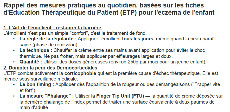 - L'éducation thérapeutique — protocoles de wet wrapping chez l'enfant, gestion des surinfections, prévention du staphylocoque
