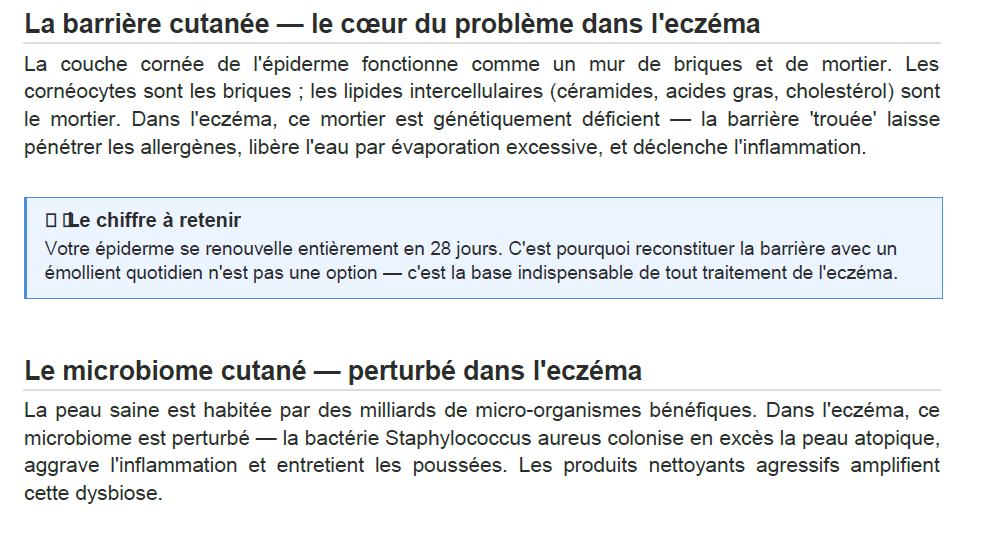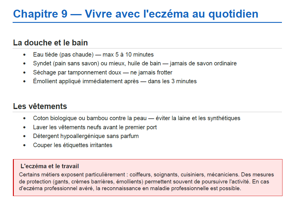 L'eczéma est la maladie de peau la plus fréquente — et l'une des plus mal gérées au quotidien, faute d'informations claires sur ce qu'on peut faire soi-même entre les consultations. Ce guide est le complément pratique de votre suivi médical.