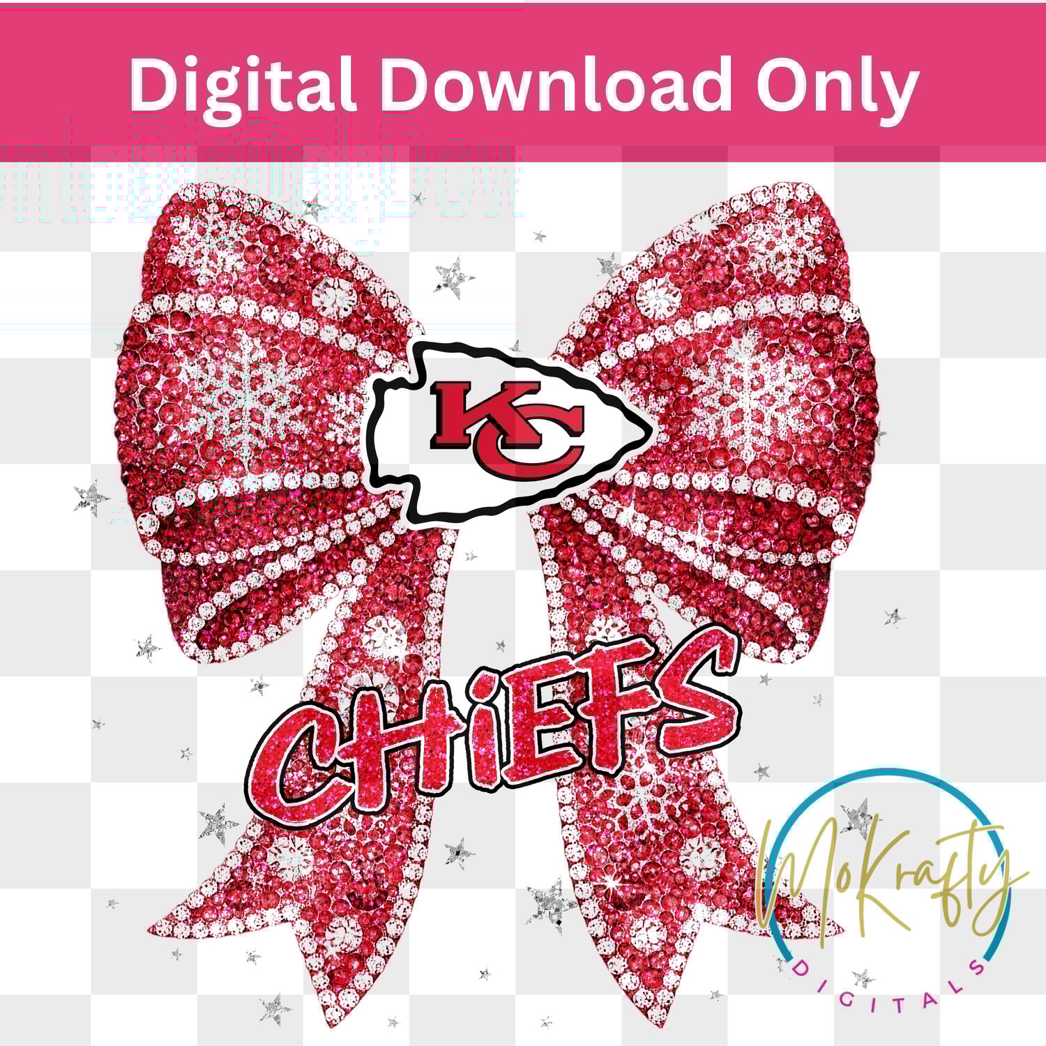 Bring full glam energy to game day with this sparkly rhinestone bow design featuring the CHIEFS colors and mascot. Perfect for shirts, tumblers, hoodies, stickers, fans, and custom game-day merch.