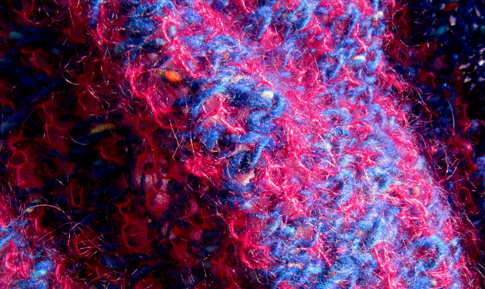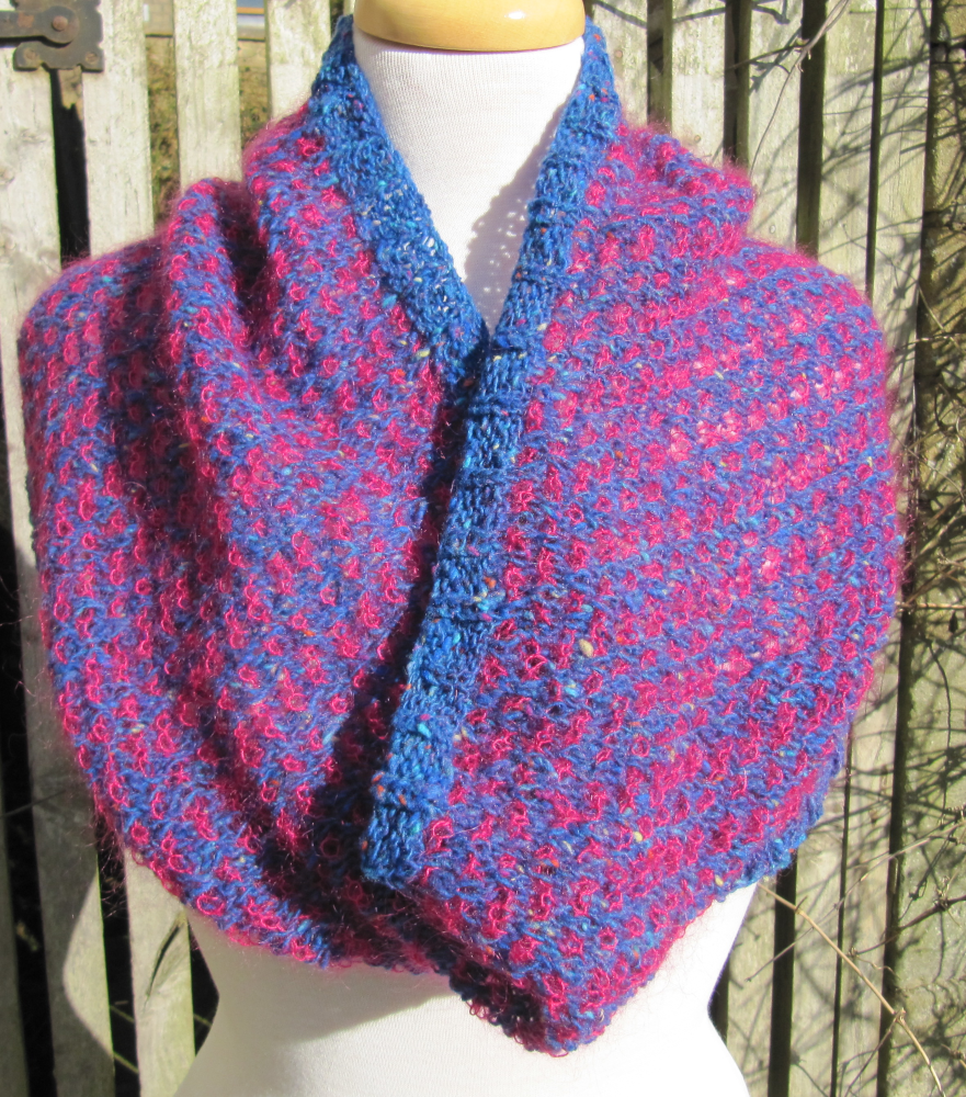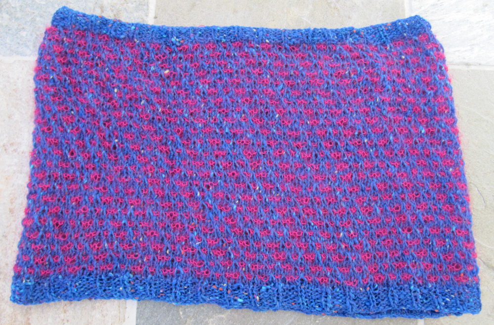 Blue and pink medium wide cowl: 33 cm / 13 ¼” tall x 100 cm / 40” in circumference.