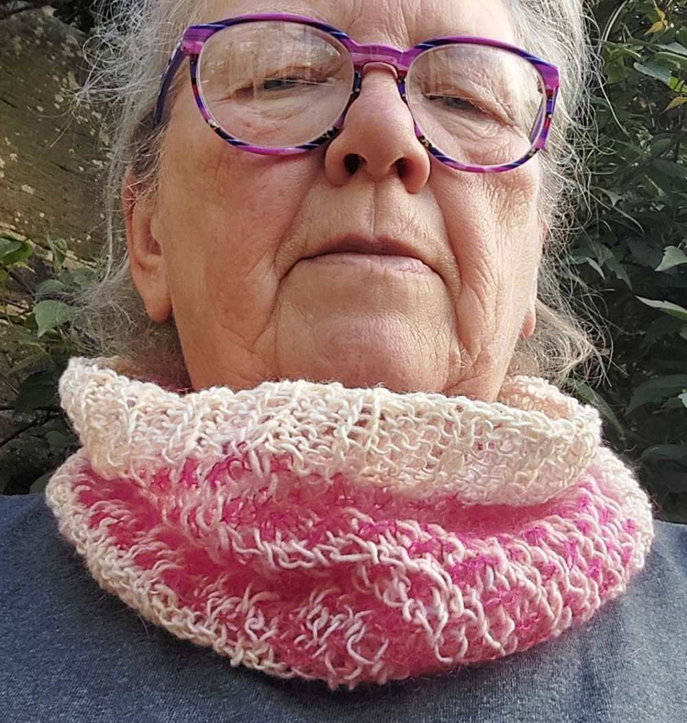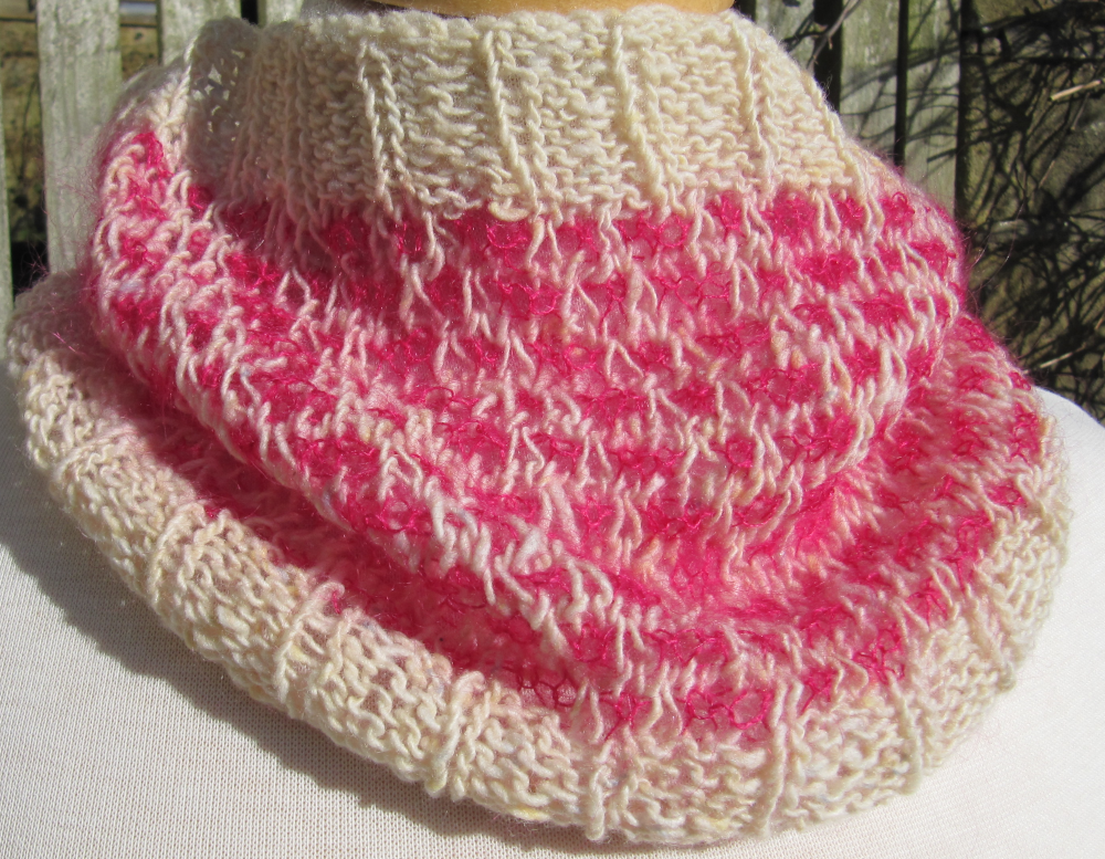 Cream and pink short narrow cowl: 22 cm / 8 ¾” tall x 65 cm / 26” in circumference.