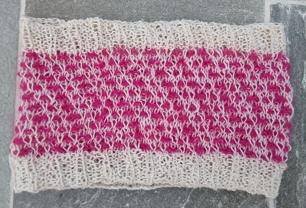 The short narrow cream and pink sample was knit in: