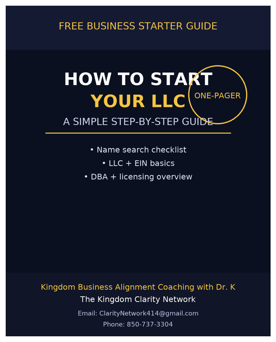 This quick and powerful “How to Start Your LLC” one-pager is designed to help new entrepreneurs take their first step toward building a legally protected, organized, and Kingdom-aligned business. Inside, you’ll find the essential steps every business owner needs — name search, LLC registration, EIN setup, DBA basics, and licensing considerations — all laid out in clear, simple language you can use immediately.