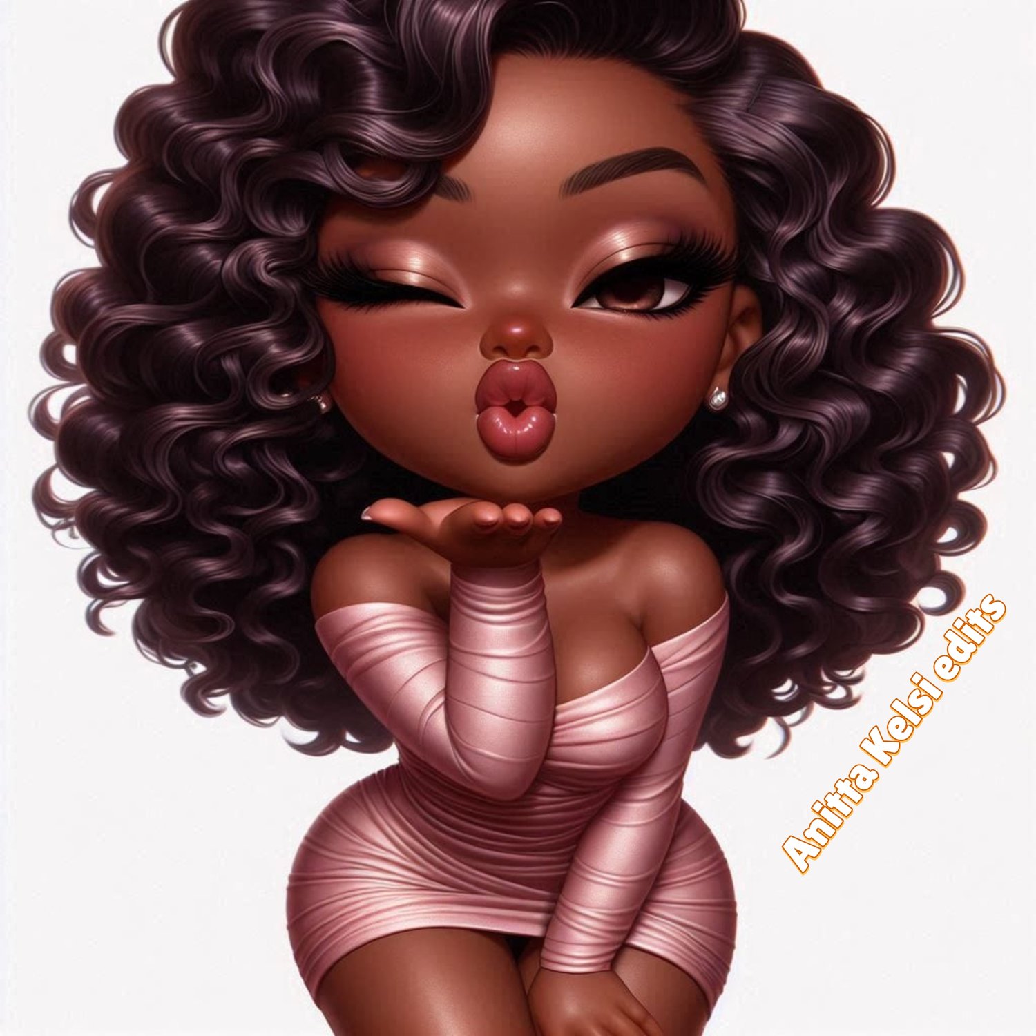 A stunning, ultra-curvy melanin chibi girl in a figure-hugging blush pink dress, blowing a kiss with confidence and charm. Her voluminous curls, glowing skin, and sassy pose bring bold feminine energy to life. Perfect for glam vibes, confident queens, and chibi lovers who slay with sweetness!
