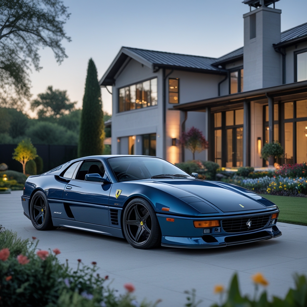 "A Ferrari Luce in a deep Smalt blue, fully customized with a Mansory body kit, featuring sleek matte black mags wheels, parked elegantly in the driveway of a luxury modern farmhouse. The house has large glass windows, clean lines, and contemporary architecture. Surrounding the driveway is a beautifully landscaped garden with lush greenery, colorful flowers, and subtle ambient lighting. The scene is captured in soft natural daylight, emphasizing the glossy blue of the car, the matte black wheels, and the luxurious, serene atmosphere of the modern farmhouse estate."