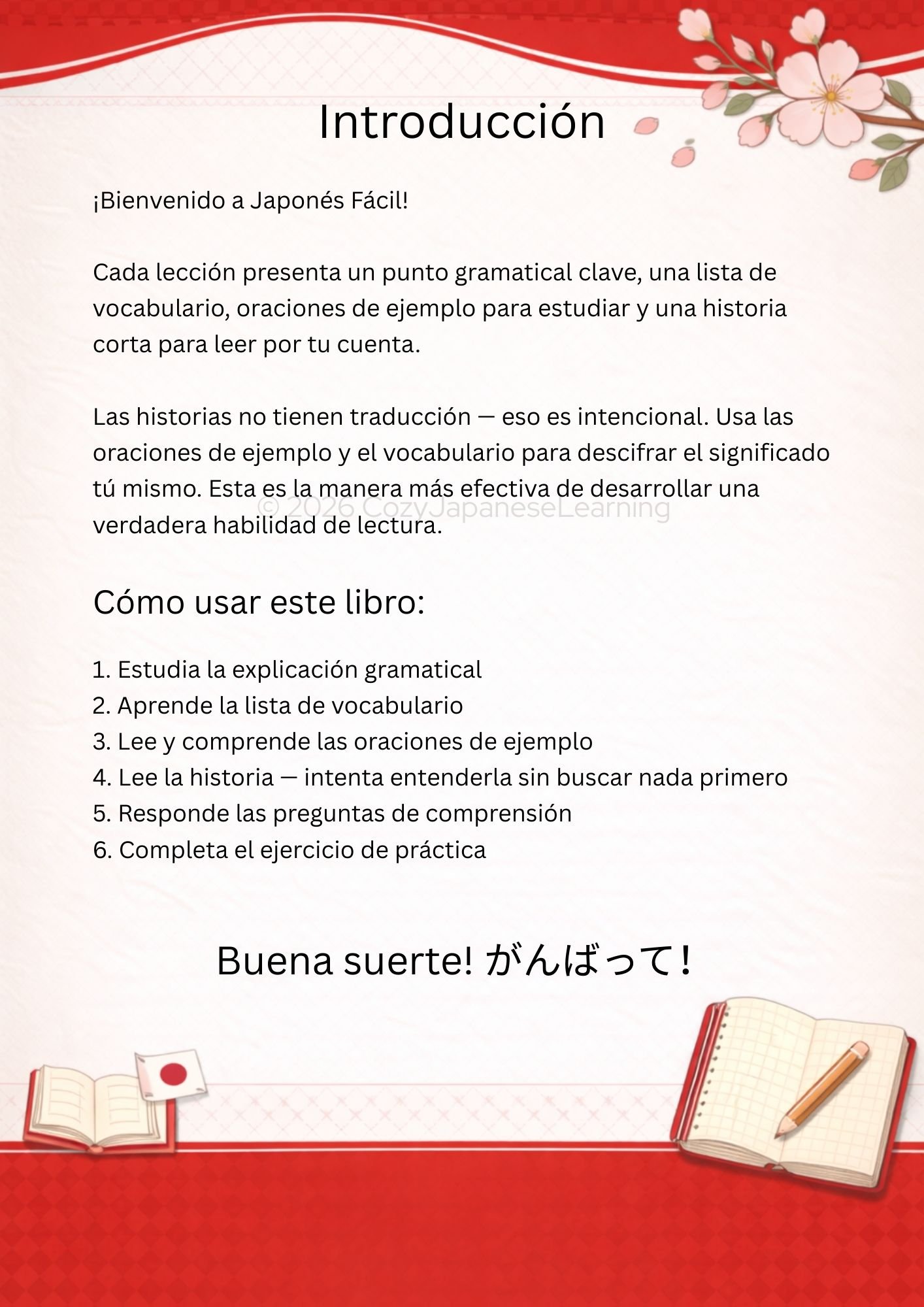Este libro es para el estudiante de japonés principiante que ya conoce el hiragana y el katakana y está listo para empezar a desarrollar gramática real y habilidad lectora. Si ya aprendiste el kana y no sabes cuál es el siguiente paso — aquí es exactamente donde debes estar.