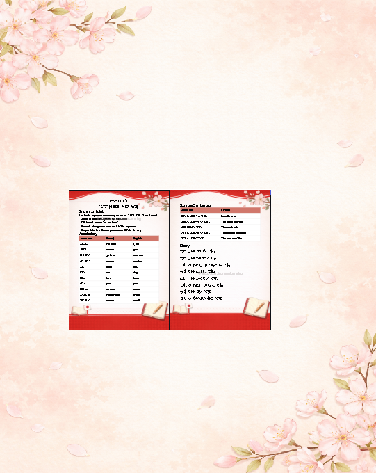 Cada una de las 10 lecciones de gramática japonesa sigue un ritmo simple y satisfactorio. Primero, se introduce un concepto gramatical a la vez — explicado con claridad, sin prisa y sin confusión. Luego, una lista de vocabulario japonés te da exactamente las palabras que necesitas. Las oraciones de ejemplo muestran cómo todo encaja, y entonces llega la mejor parte: una historia corta escrita completamente en hiragana y katakana para que la leas por tu cuenta.