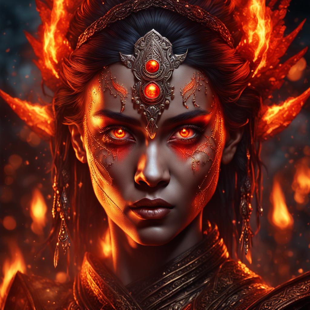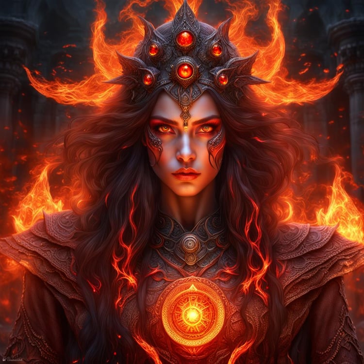 Product Description: Unleash the fiery power of the "Majestic Fire Sorceress Queen," a photorealistic digital portrait capturing the intense gaze and commanding presence of a sorceress queen in the Inferno Temple. With glowing red eyes and regal attire, she exudes majesty and raw power.