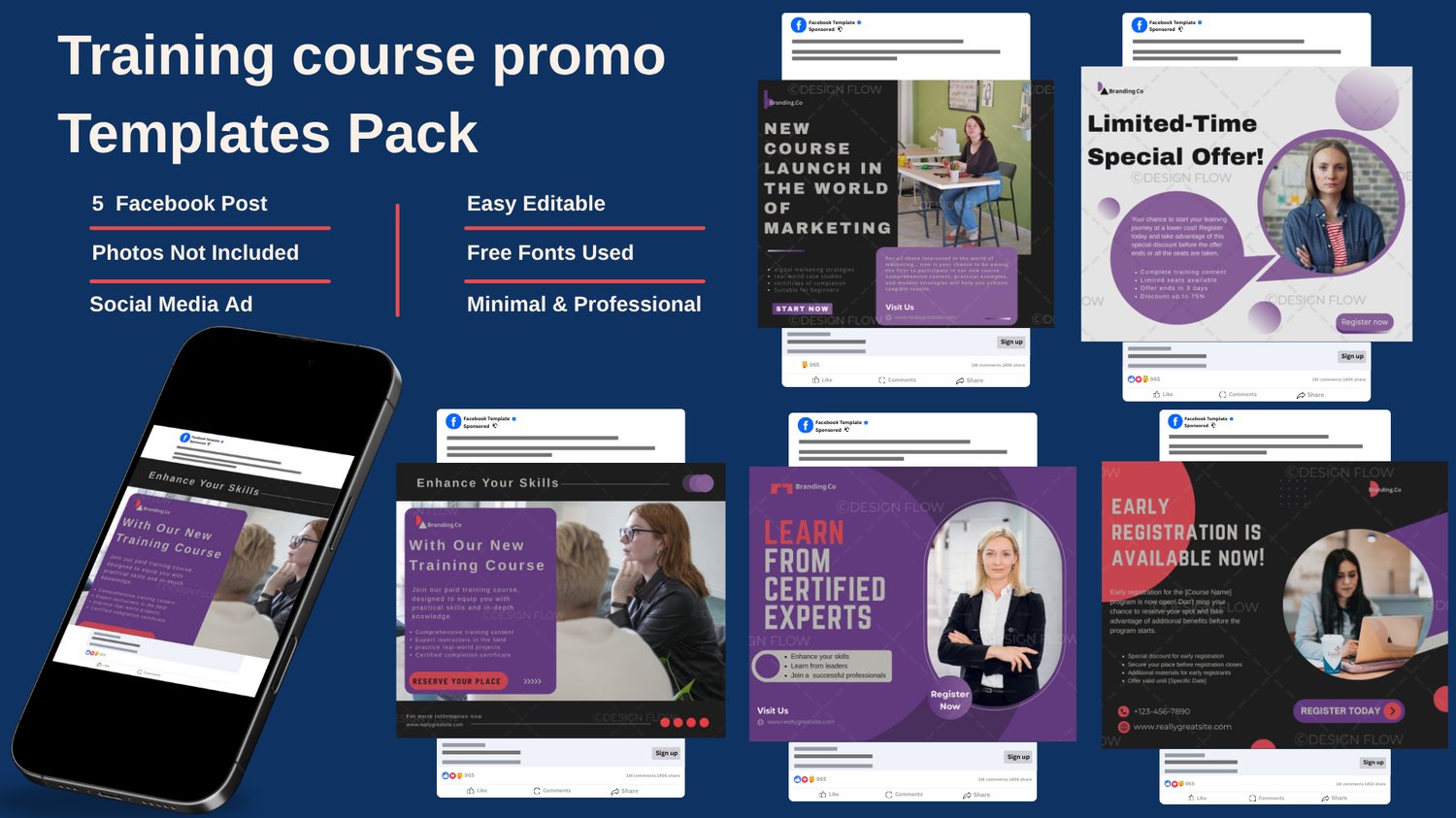 This pack of 5 editable Facebook post templates is designed to help you advertise your paid courses in a modern, professional, and eye-catching way. Whether you’re launching a new program, offering limited seats, or promoting early registration, these templates will make your posts stand out.