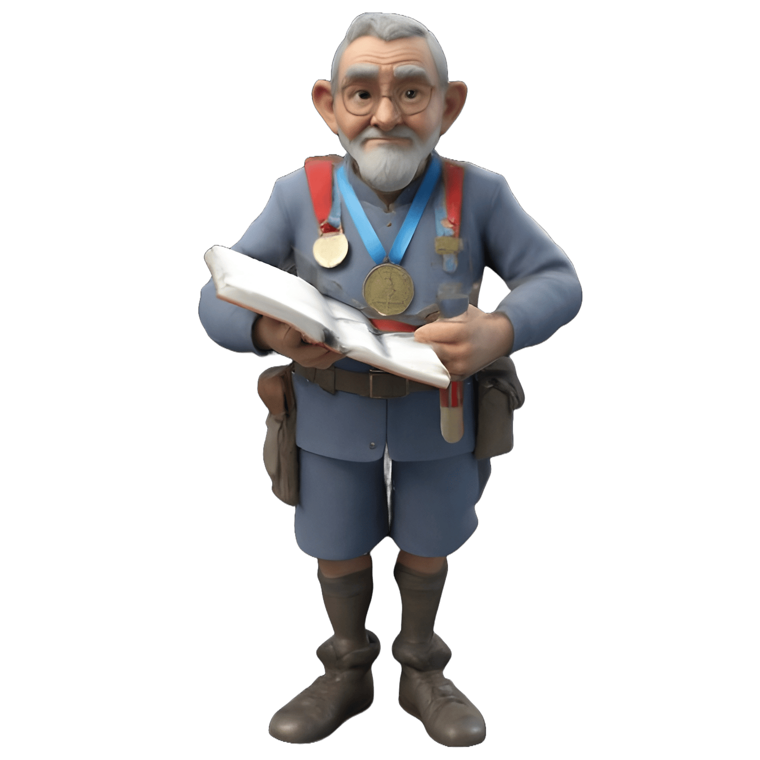 - A scholarly adventurer holding a journal, adorned with medals and ready for exploration.